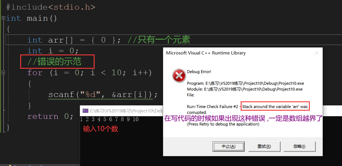 如果数组中存放的元素大于数组的大小,程序运行就会报错。