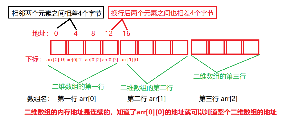 - 二维数组在内存中的存储是连续的,第二行必须放到第一行的后面。