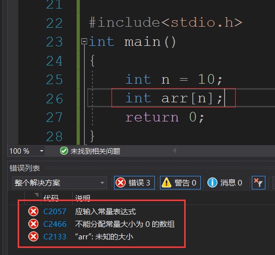 - C99标准之前是不支持数组的大小使用变量,只能使用常量!