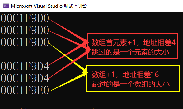 ?从结果可以看出,数组首元素的地址与数组的地址是相同的,可是两个所代表的意义并不相同。