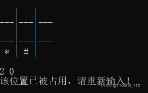 首先是玩家下棋,“*”代表玩家,先由玩家输入第几行第几列,落子之前,系统要先判断该位置是否不被占用,输入是否合法,只有都满足才能落子,否则就要重新输入,下面是代码实现:
