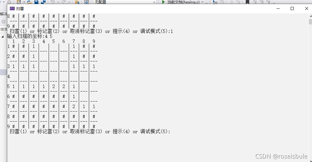 printf("扫雷(1) or 标记雷(2) or 取消标记雷(3) or 提示(4) or 调试模式(5):");