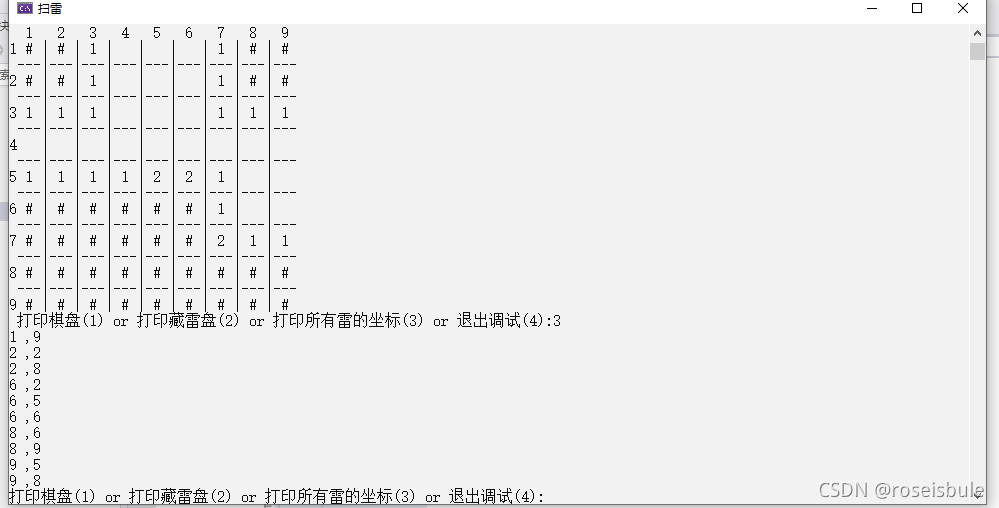 printf("打印棋盘(1) or 打印藏雷盘(2) or 打印所有雷的坐标(3) or 退出调试(4):");