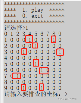 我们设定count个雷,如果我们埋下一颗雷,我们就count-1,同时我们将初始化的字符' 0 ' 变成字符' 1 ' , 只有我们识别到目标格子是字符 ' 0 ' 时才会埋雷,这也解决了在同一位置重复埋雷的问题。?
