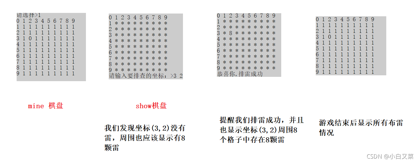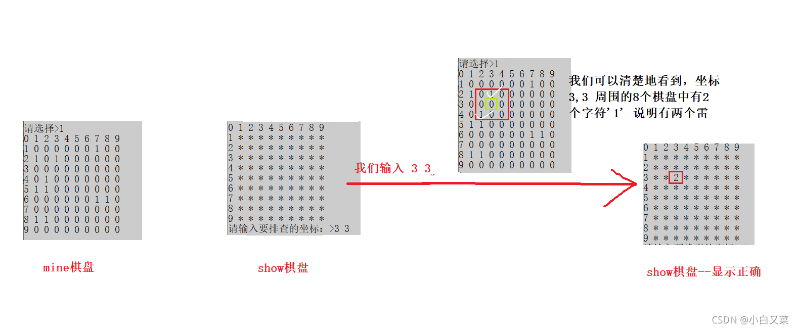 为了方便大家理解,我们假定有10个雷,我们将Mine棋盘和show棋盘都显示,我们根据棋盘制定输入,看是否可以得到我们想要的结果:
