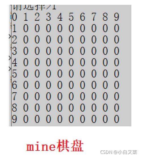 在这里我们对第一块mine棋盘全部初始化为字符 ' 0 '?(注意这里是字符0,不是数字0),我们对第二块show棋盘全部初始化为字符' * ' ,最终玩家首先会看到一幅全是字符' * '的棋盘,这样也符合游戏规则。