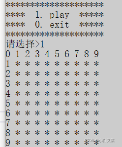 使用此语句实现玩家的自主选择,当输入1时进行扫雷游戏,当输入0时,退出游戏。显示效果如下: