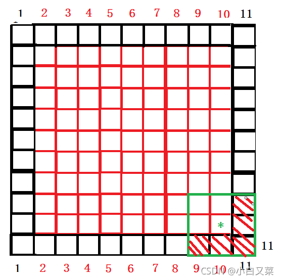 如图所示,我们假设要查找坐标为(9,9)格子周围8个格子的雷的个数,如果我们还只是9X9的格子,我们图中的红色阴影区域就处于数组的范围之外,因为我们需要创建11X11的棋盘,就可以轻松化解这个问题。