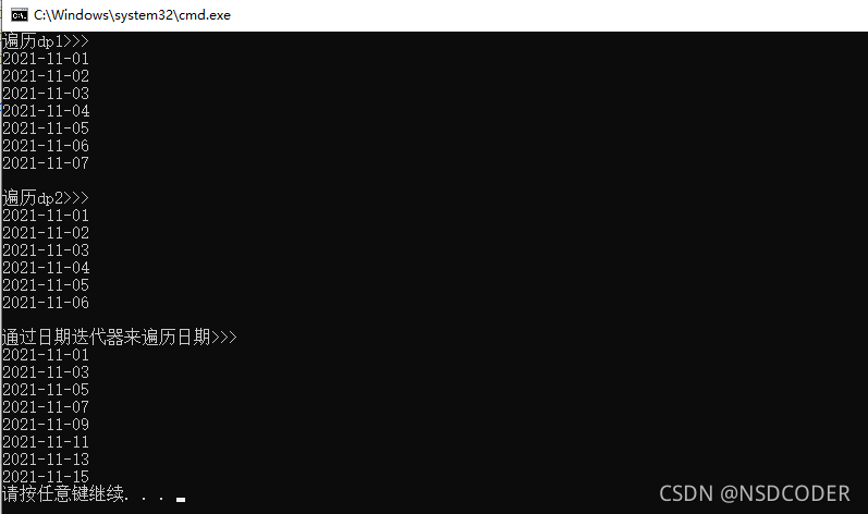printf("\n通过日期迭代器来遍历日期>>>\n");