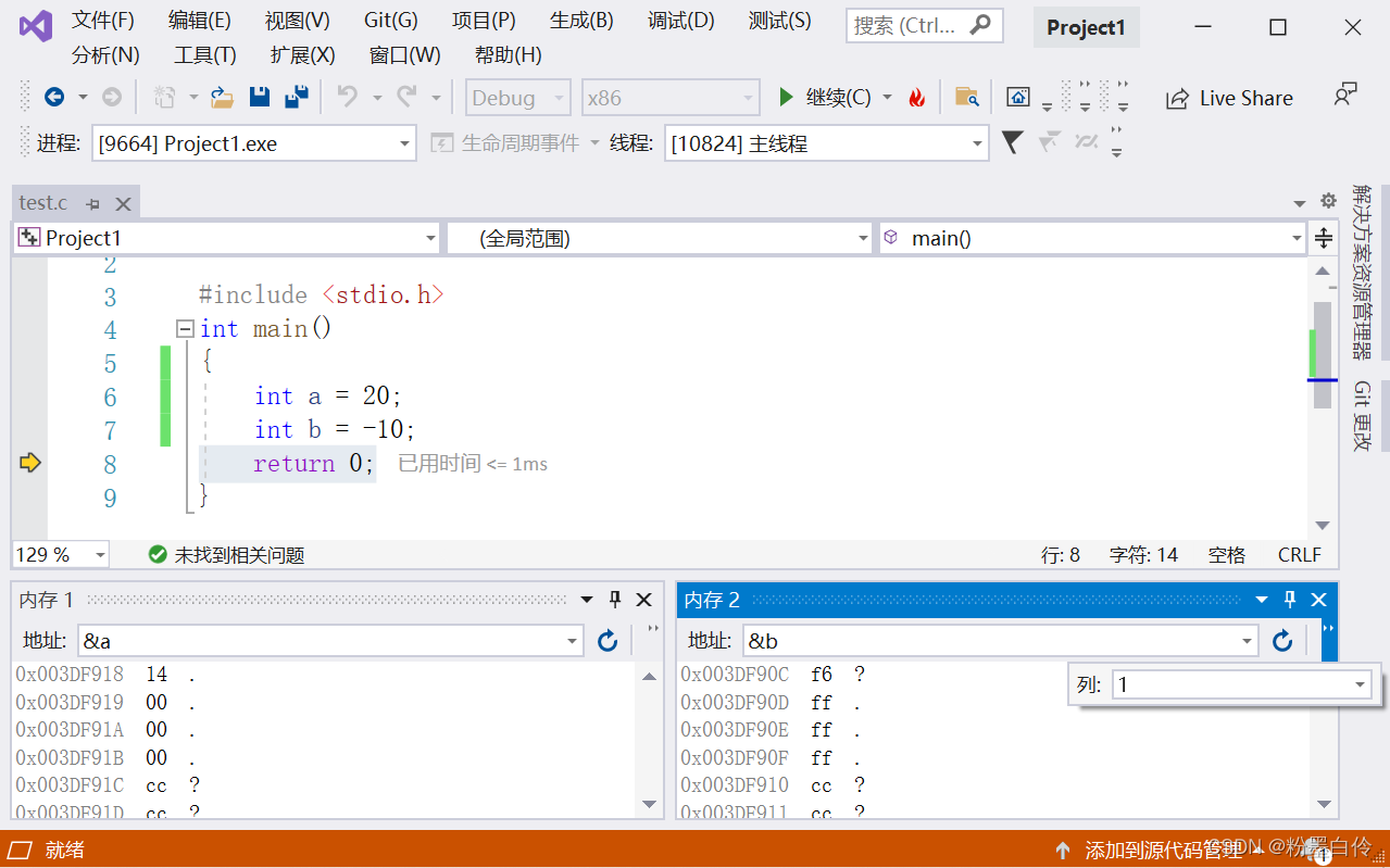 然后我们可以在编译器调试后的内存窗口中输入&a, &b观察是否正确: