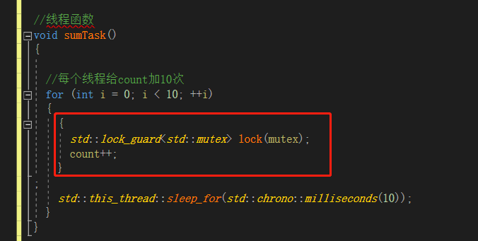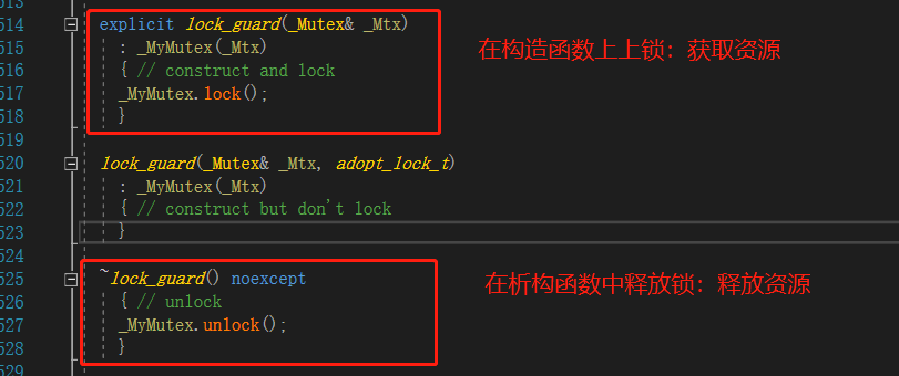 ?红框框起来就是利用了RAII思想,定义了一个lock_gurad 进行上锁,当离开{ } 作用域时,自动释放锁。来看一下lock_guard的实现: