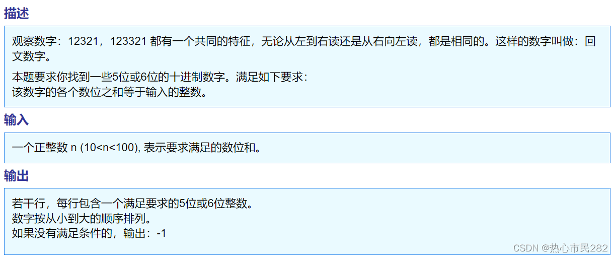 Plan B 先循环10000-999999找到 各位和 等于n 的数,再判断是否为回文数。
