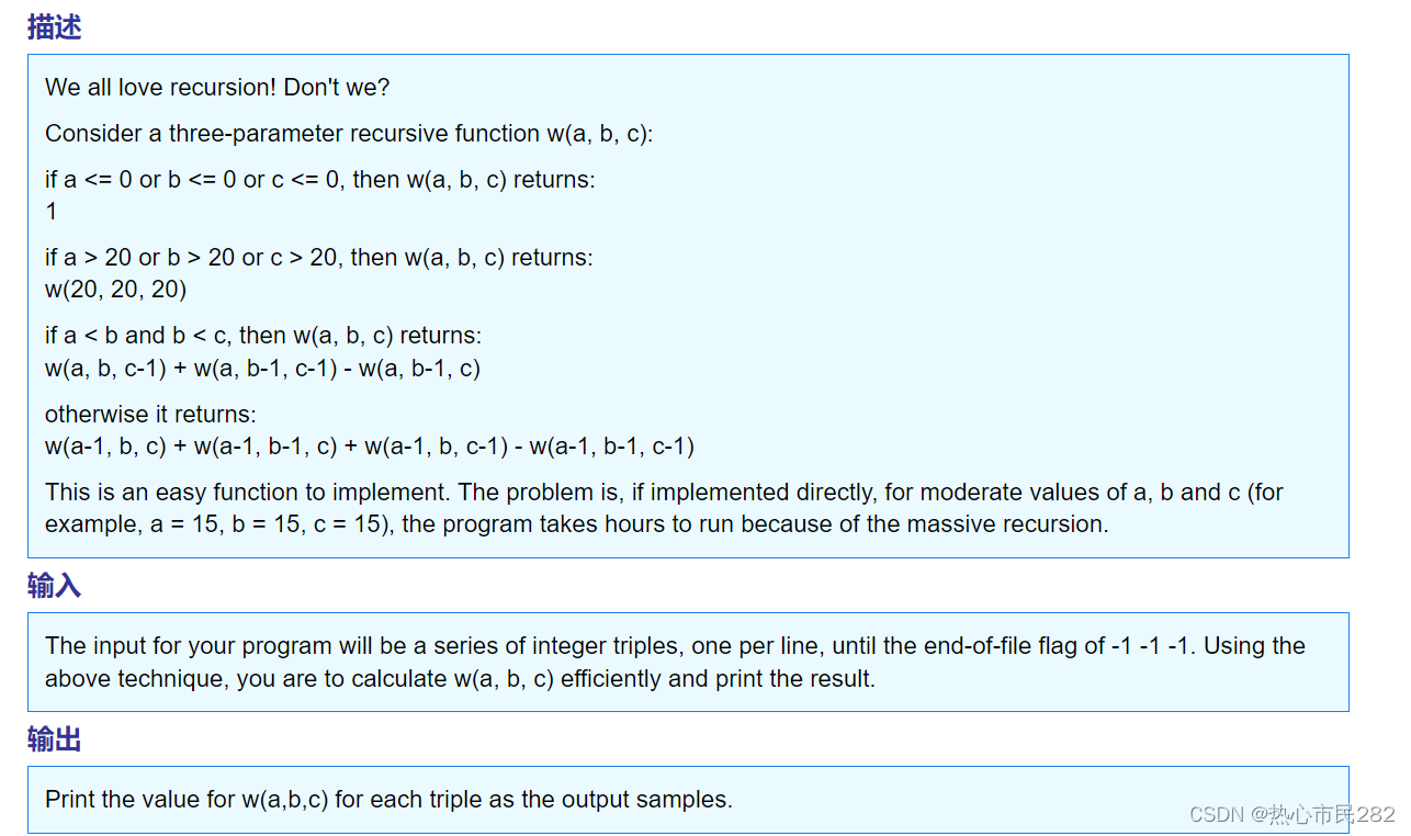 else printf("w(%d, %d, %d) = %d\n",a,b,c,w[a][b][c]);