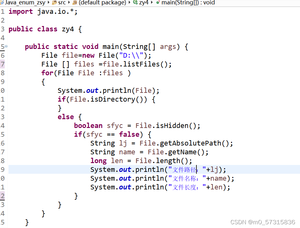 import java.io.*; ? public class zy4 { ?? ? ?? ?public static void main(String[] args) { ?? ??? ? ?? ??? ?File file=new File("D:\\"); ?? ??? ?File [] files =file.listFiles();? ?? ??? ?for(File File :files ) ?? ??? ?{ ?? ??? ??? ?System.out.println(File); ?? ??? ??? ?if(File.isDirectory()) { ?? ??? ??? ?} ?? ??? ??? ?else { ?? ??? ??? ??? ?boolean sfyc = File.isHidden(); ?? ??? ??? ??? ?if(sfyc == false) { ?? ??? ??? ??? ??? ?String lj = File.getAbsolutePath(); ?? ??? ??? ??? ??? ?String name = File.getName(); ?? ??? ??? ??? ??? ?long len = File.length(); ?? ??? ??? ??? ??? ?System.out.println("文件路径:"+lj); ?? ??? ??? ??? ??? ?System.out.println("文件名称:"+name); ?? ??? ??? ??? ??? ?System.out.println("文件长度:"+len); ?? ??? ??? ??? ?} ?? ??? ??? ?} ?? ??? ?} ?? ?} }