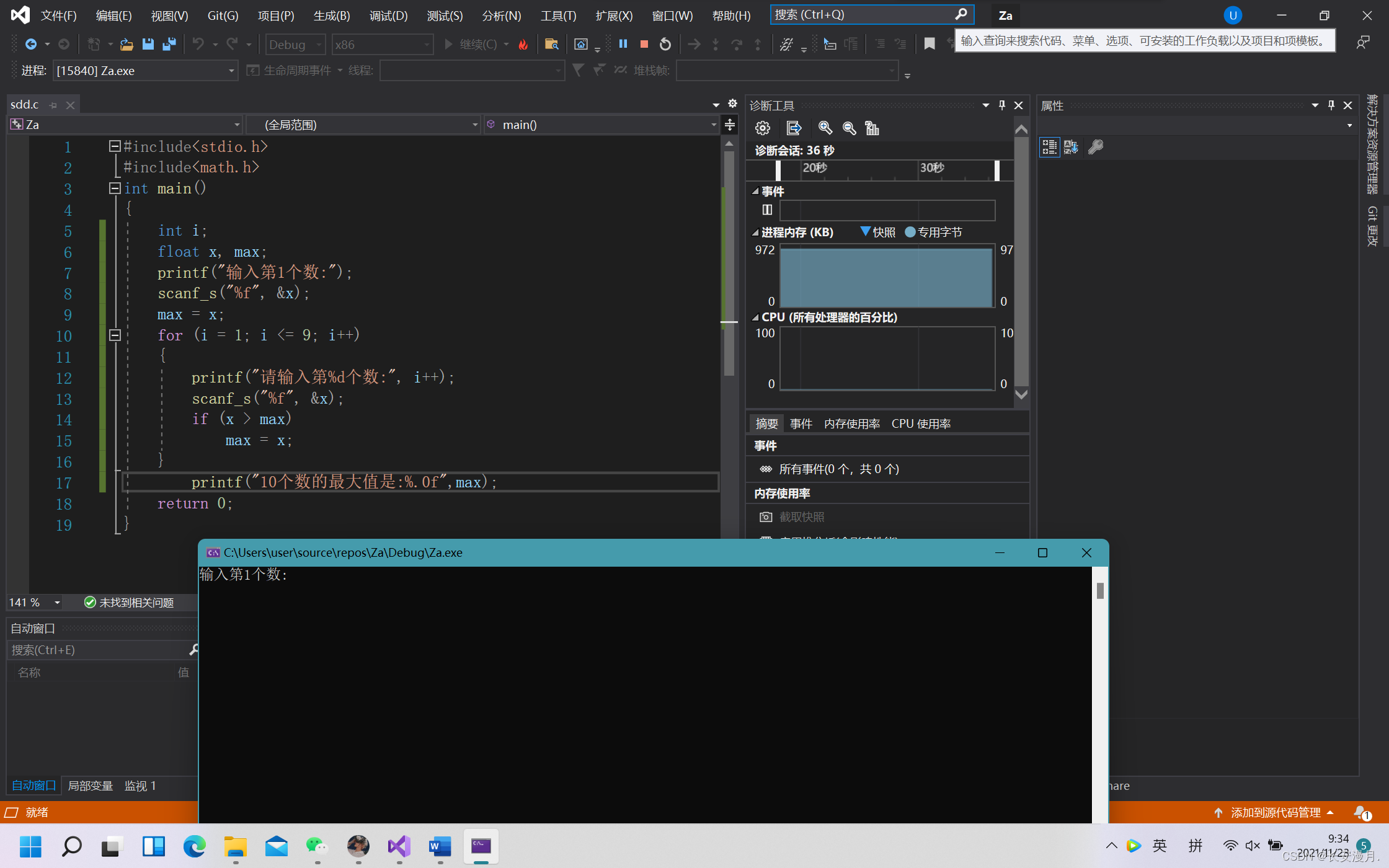 #include<stdio.h> #include<math.h> int main() { ?int i; ?float x, max; ?printf("输入第1个数:"); ?scanf_s("%f", &x); ?max = x; ?for (i = 1; i <= 9; i++) ?{ ? printf("请输入第%d个数:", i++); ? scanf_s("%f", &x); ? if (x > max) ? ?max = x; ?} ? printf("10个数的最大值是:%.0f",max); ?return 0; }