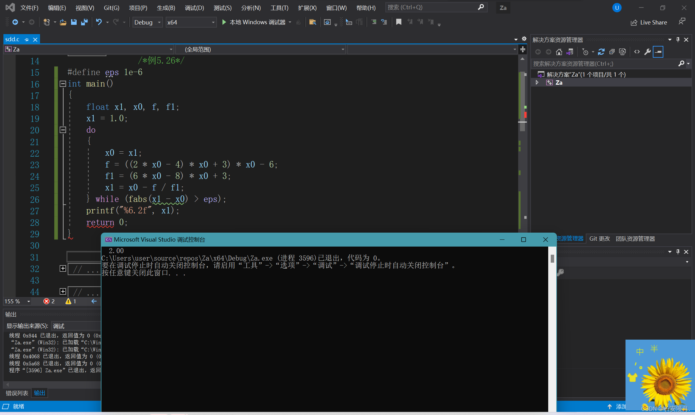 int main() { ? ? float x1, x0, f, f1; ? ? x1 = 1.0; ? ? do ? ? { ? ? ? ? x0 = x1; ? ? ? ? f = ((2 * x0 - 4) * x0 + 3) * x0 - 6; ? ? ? ? f1 = (6 * x0 - 8) * x0 + 3; ? ? ? ? x1 = x0 - f / f1; ? ? } while (fabs(x1 - x0) > eps); ? ? printf("%6.2f", x1); ? ? return 0; }