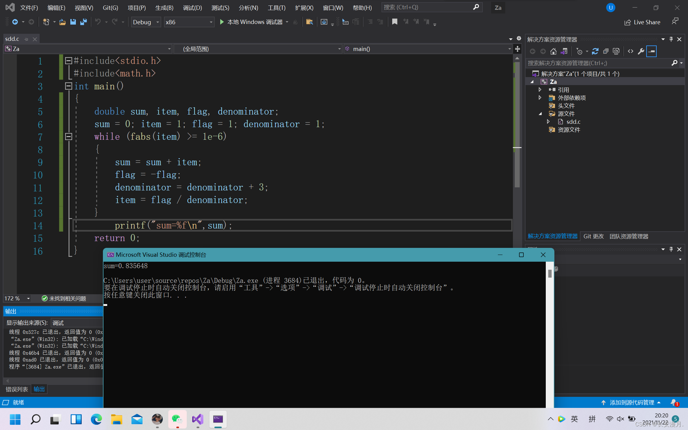 #include<stdio.h> #include<math.h> int main() { ?double sum, item, flag, denominator; ?sum = 0; item = 1; flag = 1; denominator = 1; ?while (fabs(item) >= 1e-6) ?{ ? sum = sum + item; ? flag = -flag; ? denominator = denominator + 3; ? item = flag / denominator; ?} ? printf("sum=%f\n",sum); ?return 0; }