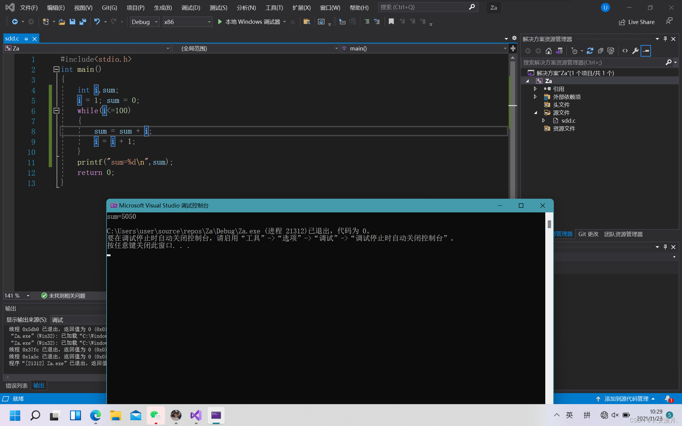 #include<stdio.h> int main() { ?int i,sum; ?i = 1; sum = 0; ?while(i<=100) ?{ ? sum = sum + i; ? i = i + 1; ?} ?printf("sum=%d\n",sum); ?return 0; }