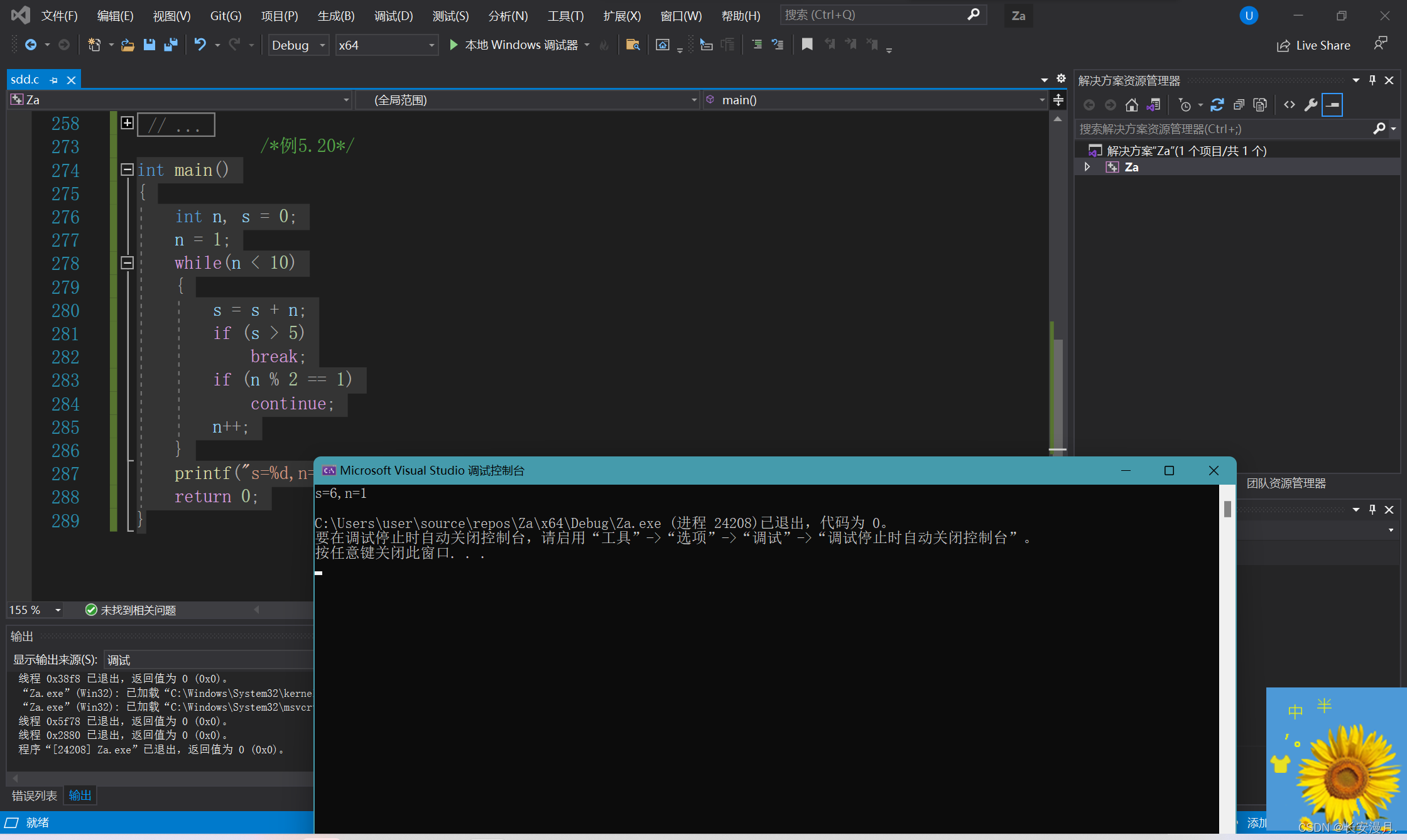 int main() { ? ? int n, s = 0; ? ? n = 1; ? ? while(n < 10) ? ? { ? ? ? ? s = s + n; ? ? ? ? if (s > 5) ? ? ? ? ? ? break; ? ? ? ? if (n % 2 == 1) ? ? ? ? ? ? continue; ? ? ? ? n++; ? ? } ? ? printf("s=%d,n=%d\n", s, n); ? ? return 0; }