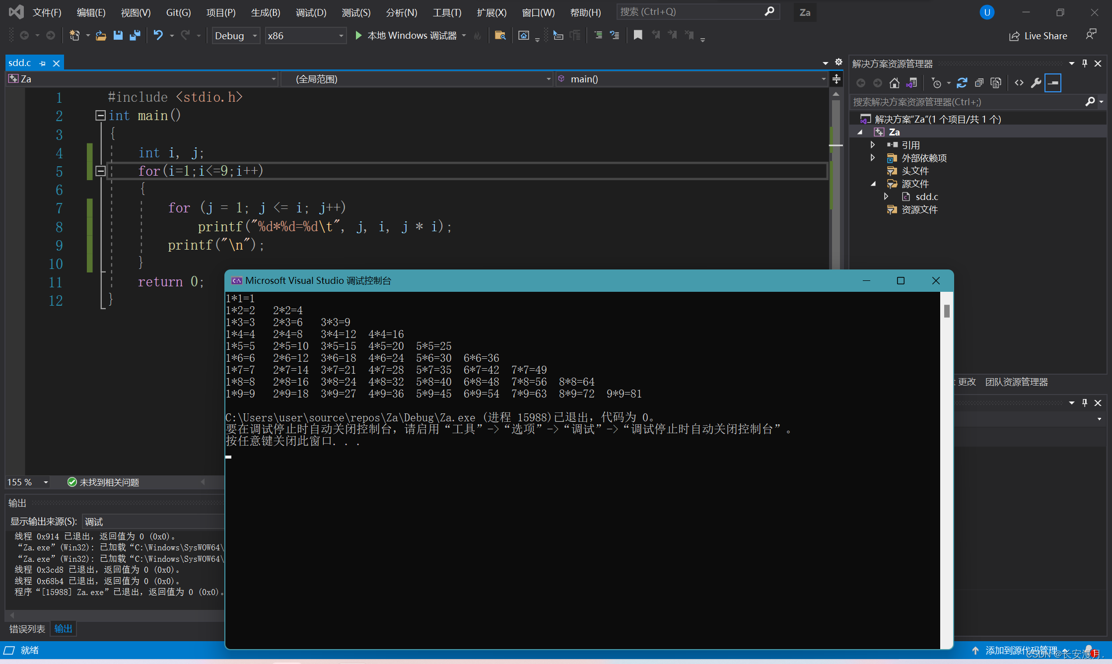 #include <stdio.h> int main() { ?int i, j; ?for(i=1;i<=9;i++) ?{ ? for (j = 1; j <= i; j++) ? ?printf("%d*%d=%d\t", j, i, j * i); ? printf("\n"); ?} ?return 0; }