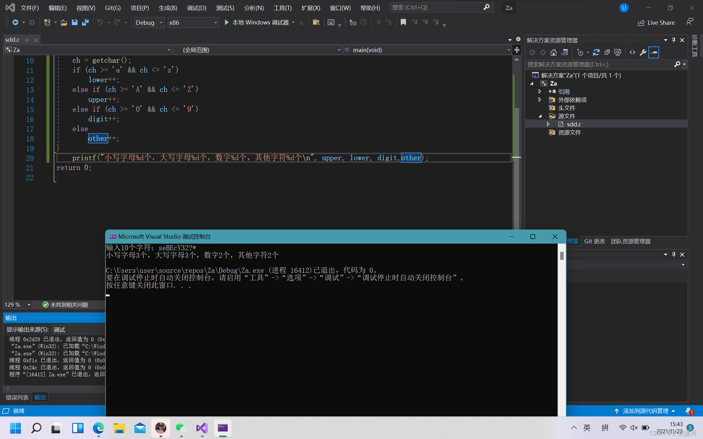 - 程序中使用字符输入函数个体插入()读入字符,使用多分支if结构实现分支,用了逻辑表达式判断字符的种类。
