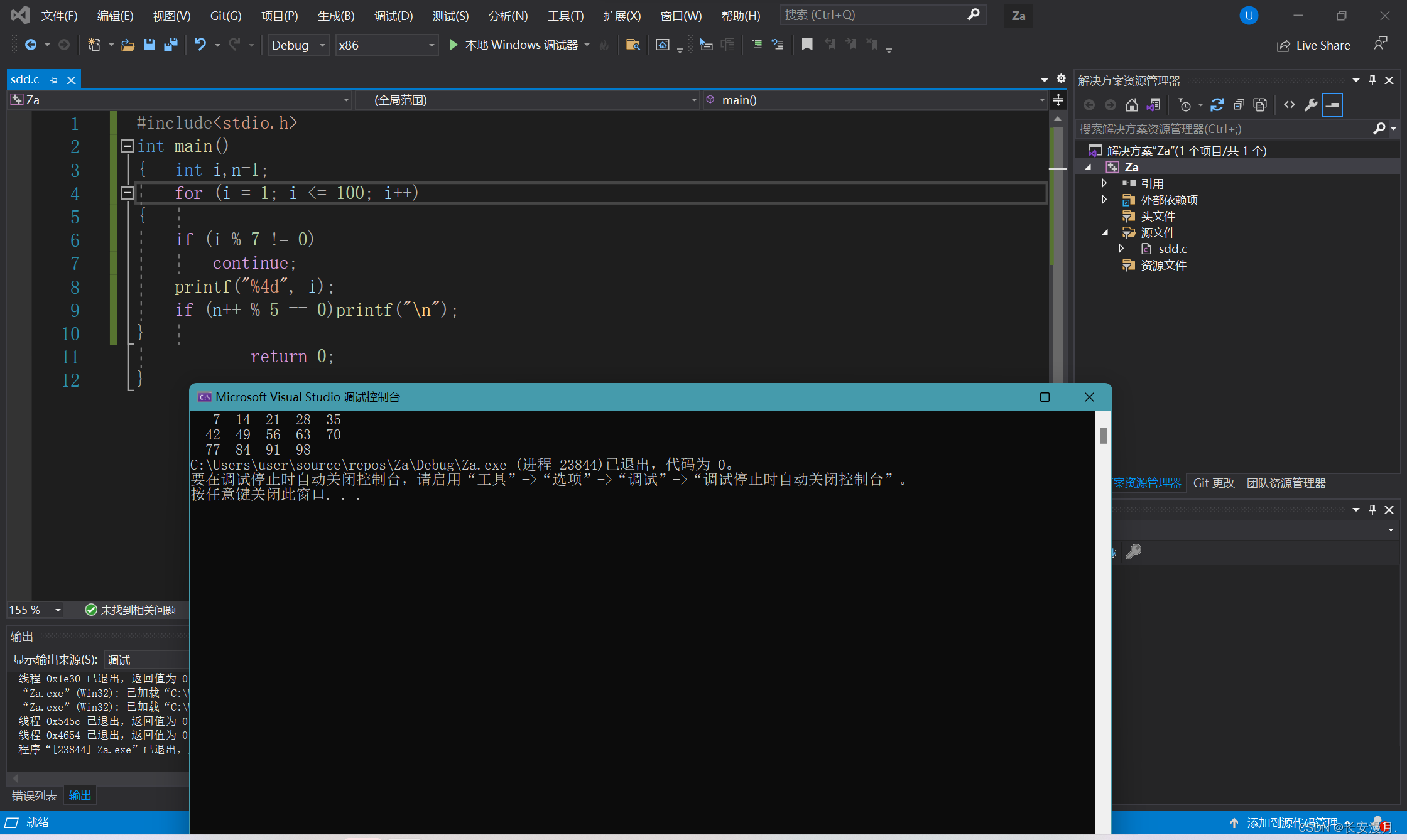 说明:1.“if(i%7!=0)continue;”语句的功能是:如果n不能被7整除,则结束本次循环,转而执行“i++;”,继续下次循环#include<stdio.h> int main() { int i,n=1; ?for (i = 1; i <= 100; i++) { ?if (i % 7 != 0) ? continue; ?printf("%4d", i); ?if (n++ % 5 == 0)printf("\n"); } ? ?return 0; }