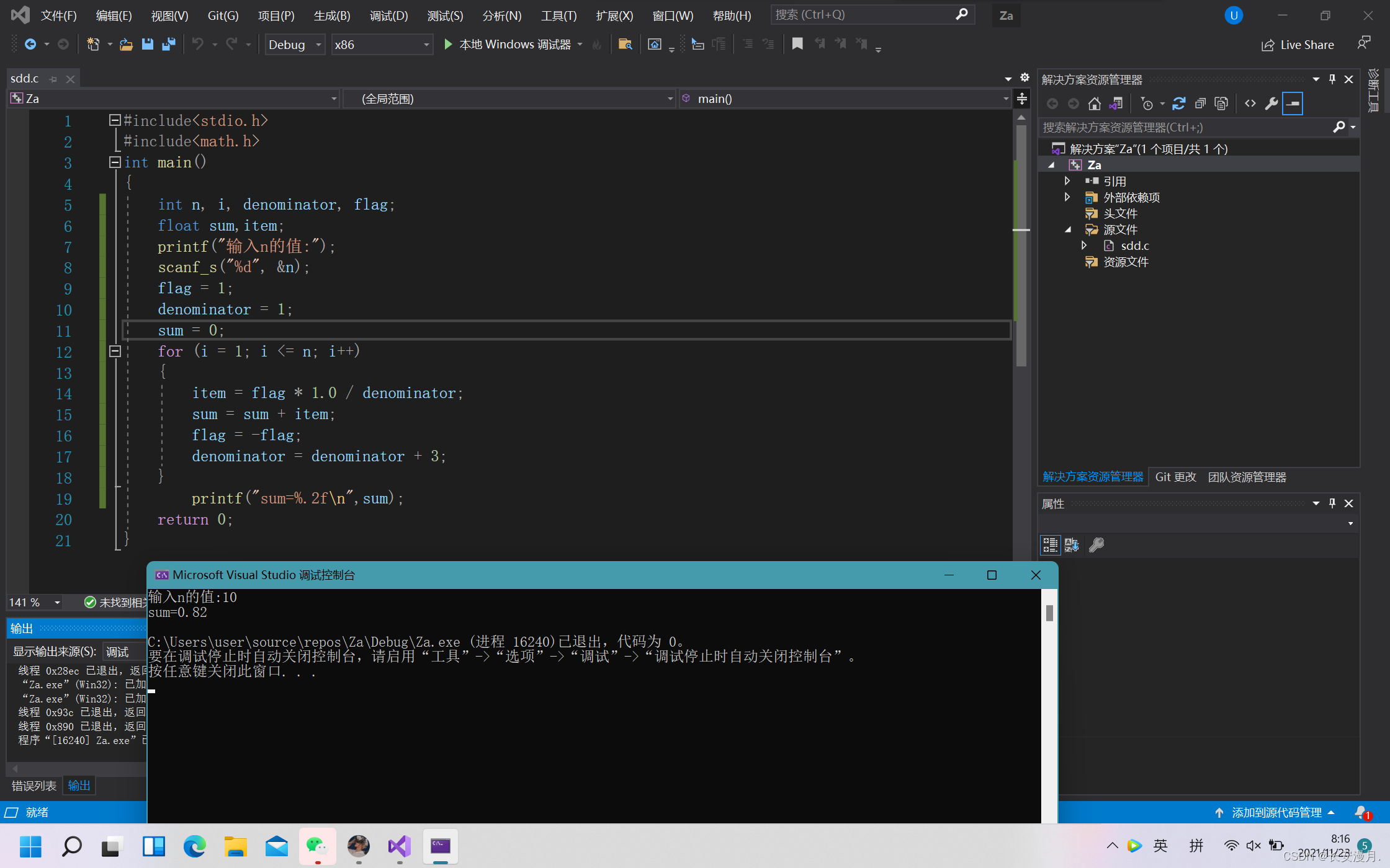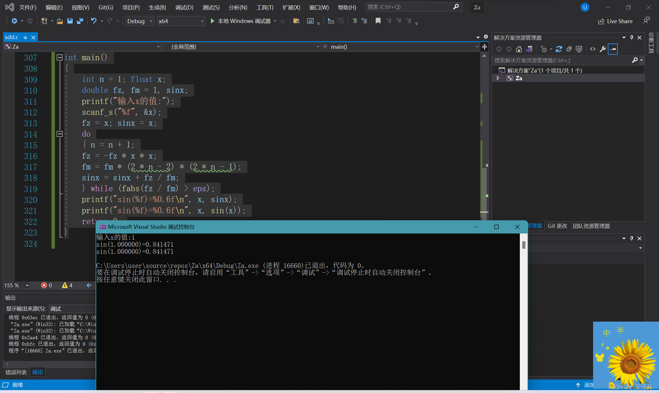int main() { ? ? int n = 1; float x; ? ? double fz, fm = 1, sinx; ? ? printf("输入x的值:"); ? ? scanf_s("%f", &x); ? ? fz = x; sinx = x; ? ? do ? ? { n = n + 1; ? ? fz = -fz * x * x; ? ? fm = fm * (2 * n - 2) * (2 * n - 1); ? ? sinx = sinx + fz / fm; ? ? } while (fabs(fz / fm) > eps); ? ? printf("sin(%f)=%0.6f\n", x, sinx); ? ? printf("sin(%f)=%0.6f\n", x, sin(x)); ? ? return 0; }