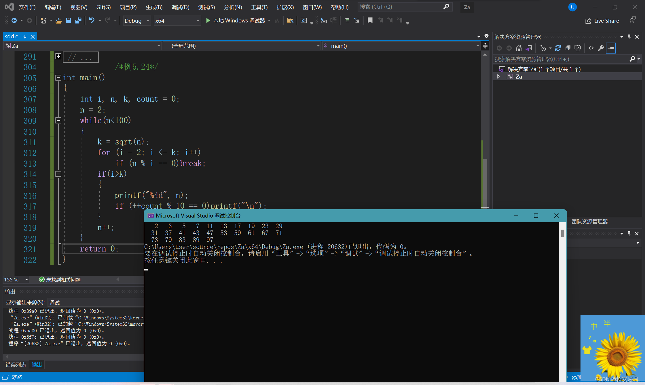 int main() { ? ? int i, n, k, count = 0; ? ? n = 2; ? ? while(n<100) ? ? { ? ? ? ? k = sqrt(n); ? ? ? ? for (i = 2; i <= k; i++) ? ? ? ? ? ? if (n % i == 0)break; ? ? ? ? if(i>k) ? ? ? ? { ? ? ? ? ? ? printf("%4d", n); ? ? ? ? ? ? if (++count % 10 == 0)printf("\n"); ? ? ? ? } ? ? ? ? n++; ? ? } ? ? return 0; }