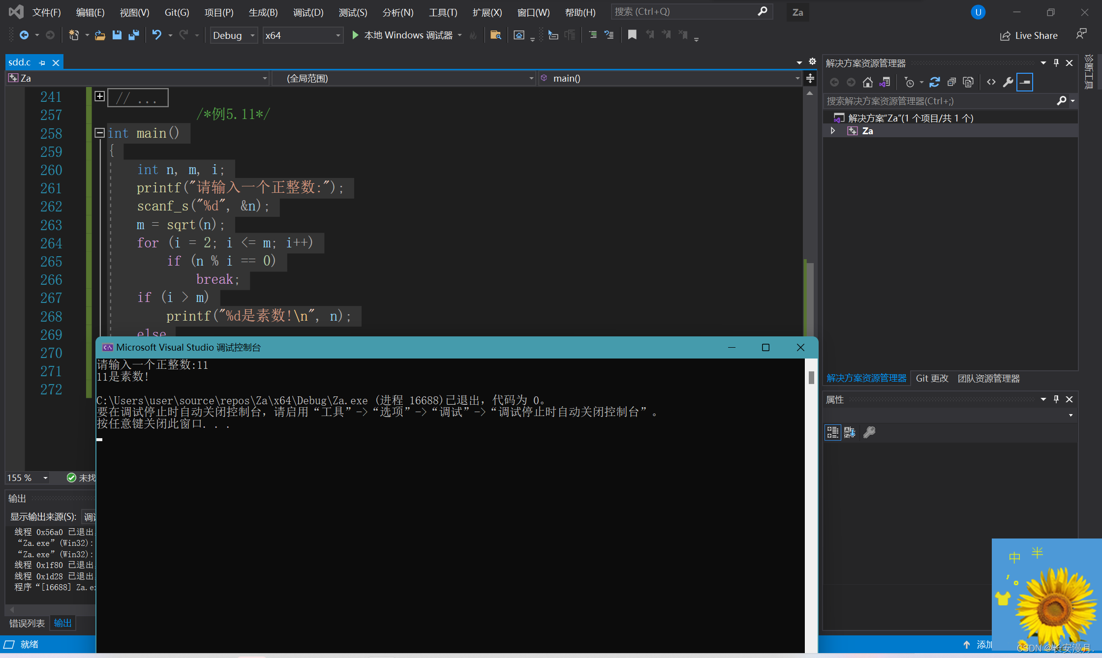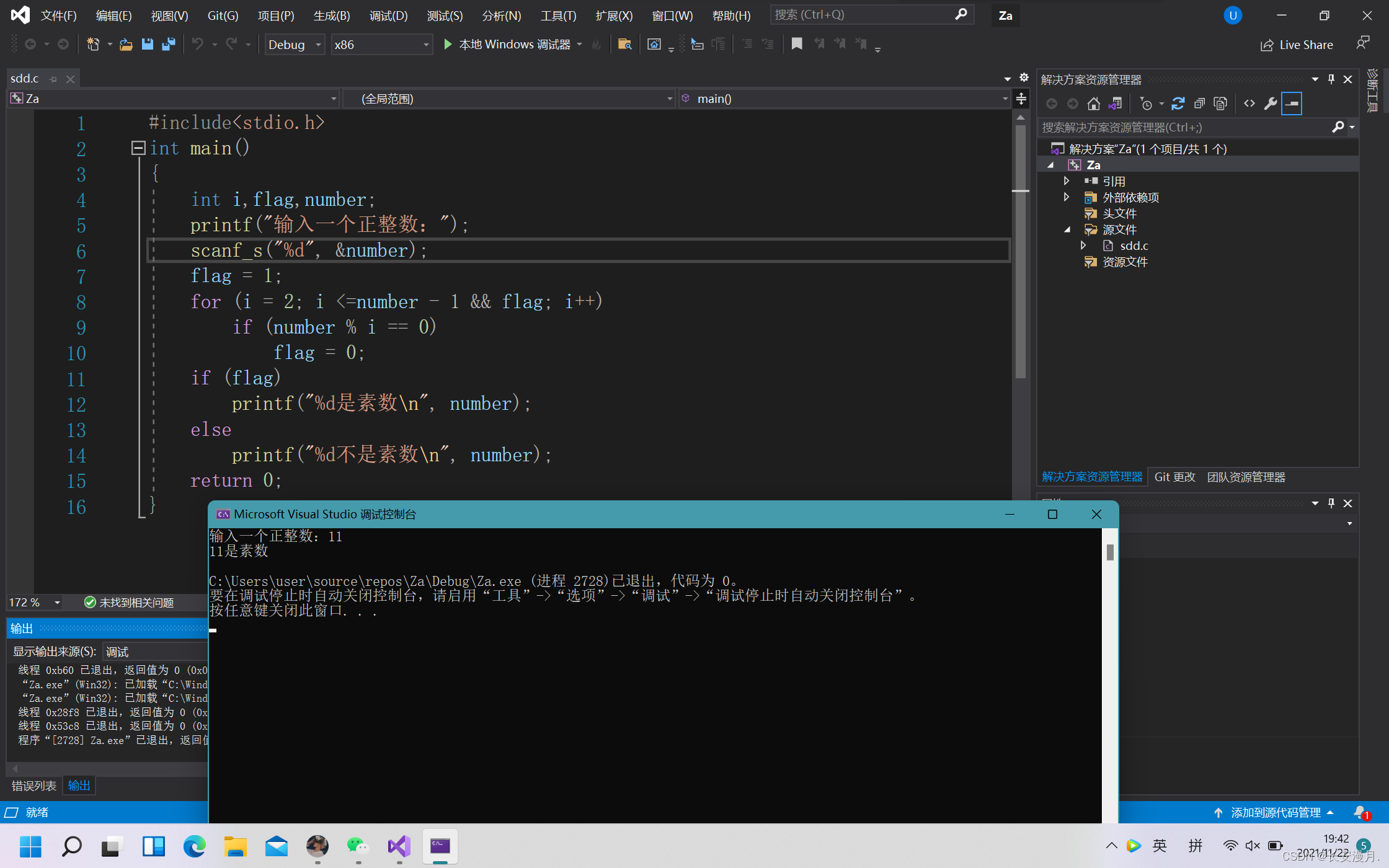 { ? ? int n, m, i; ? ? printf("请输入一个正整数:"); ? ? scanf_s("%d", &n); ? ? m = sqrt(n); ? ? for (i = 2; i <= m; i++) ? ? ? ? if (n % i == 0) ? ? ? ? ? ? break; ? ? if (i > m) ? ? ? ? printf("%d是素数!\n", n); ? ? else ? ? ? ? printf("%d不是素数!\n", n); ? ? return 0; }