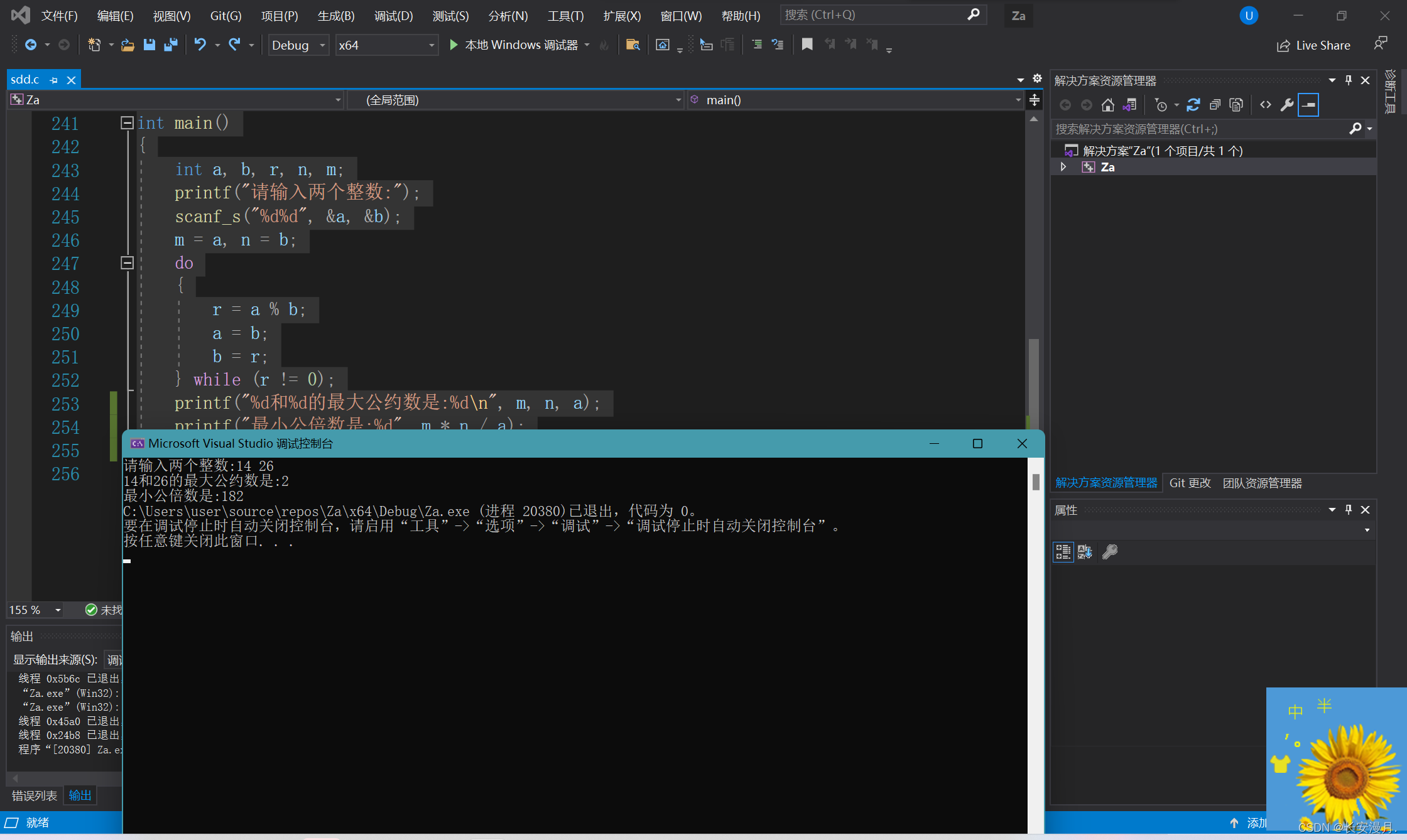 { ? ? int a, b, r, n, m; ? ? printf("请输入两个整数:"); ? ? scanf_s("%d%d", &a, &b); ? ? m = a, n = b; ? ? do ? ? { ? ? ? ? r = a % b; ? ? ? ? a = b; ? ? ? ? b = r; ? ? } while (r != 0); ? ? printf("%d和%d的最大公约数是:%d\n", m, n, a); ? ? printf("最小公倍数是:%d", m * n / a); ? ? return 0; }