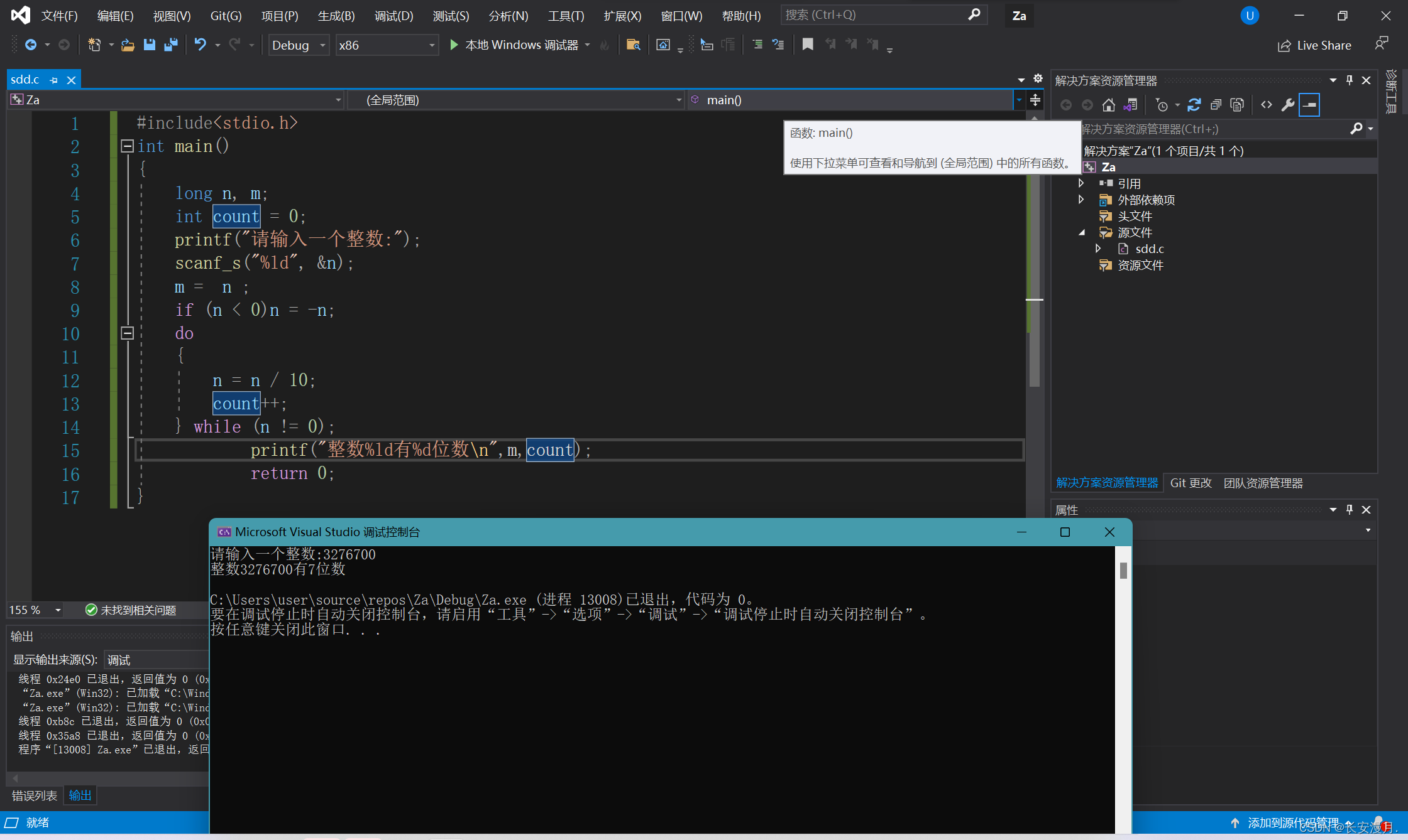 #include<stdio.h> int main() { ?long n, m; ?int count = 0; ?printf("请输入一个整数:"); ?scanf_s("%ld", &n); ?m = ?n ; ?if (n < 0)n = -n; ?do ?{ ? n = n / 10; ? count++; ?} while (n != 0); ? ?printf("整数%ld有%d位数\n",m,count); ? ?return 0; }