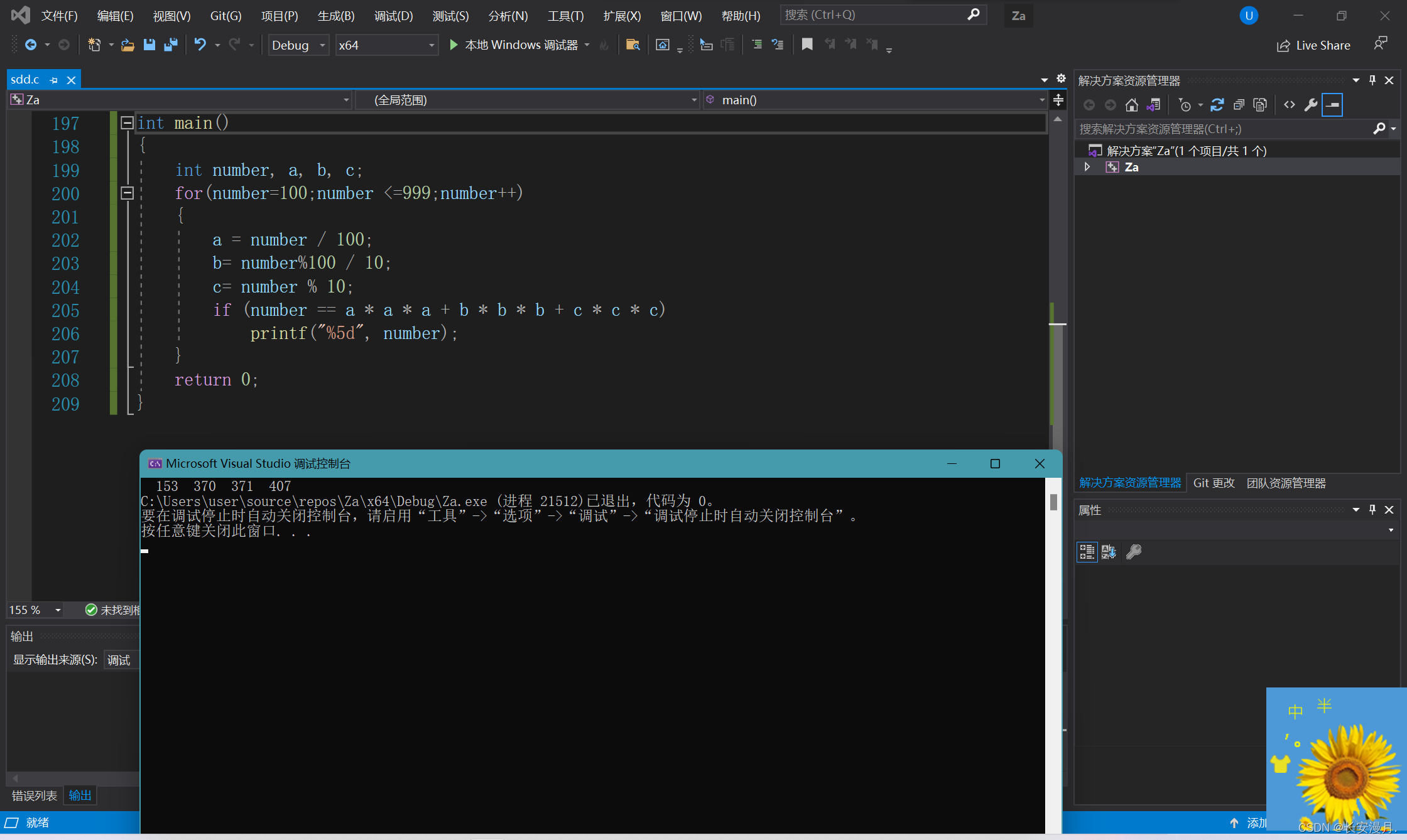 int main() { ? ? int number, a, b, c; ? ? for(number=100;number <=999;number++) ? ? { ? ? ? ? a = number / 100; ? ? ? ? b= number%100 / 10; ? ? ? ? c= number % 10; ? ? ? ? if (number == a * a * a + b * b * b + c * c * c) ? ? ? ? ? ? printf("%5d", number); ? ? } ? ? return 0; }?