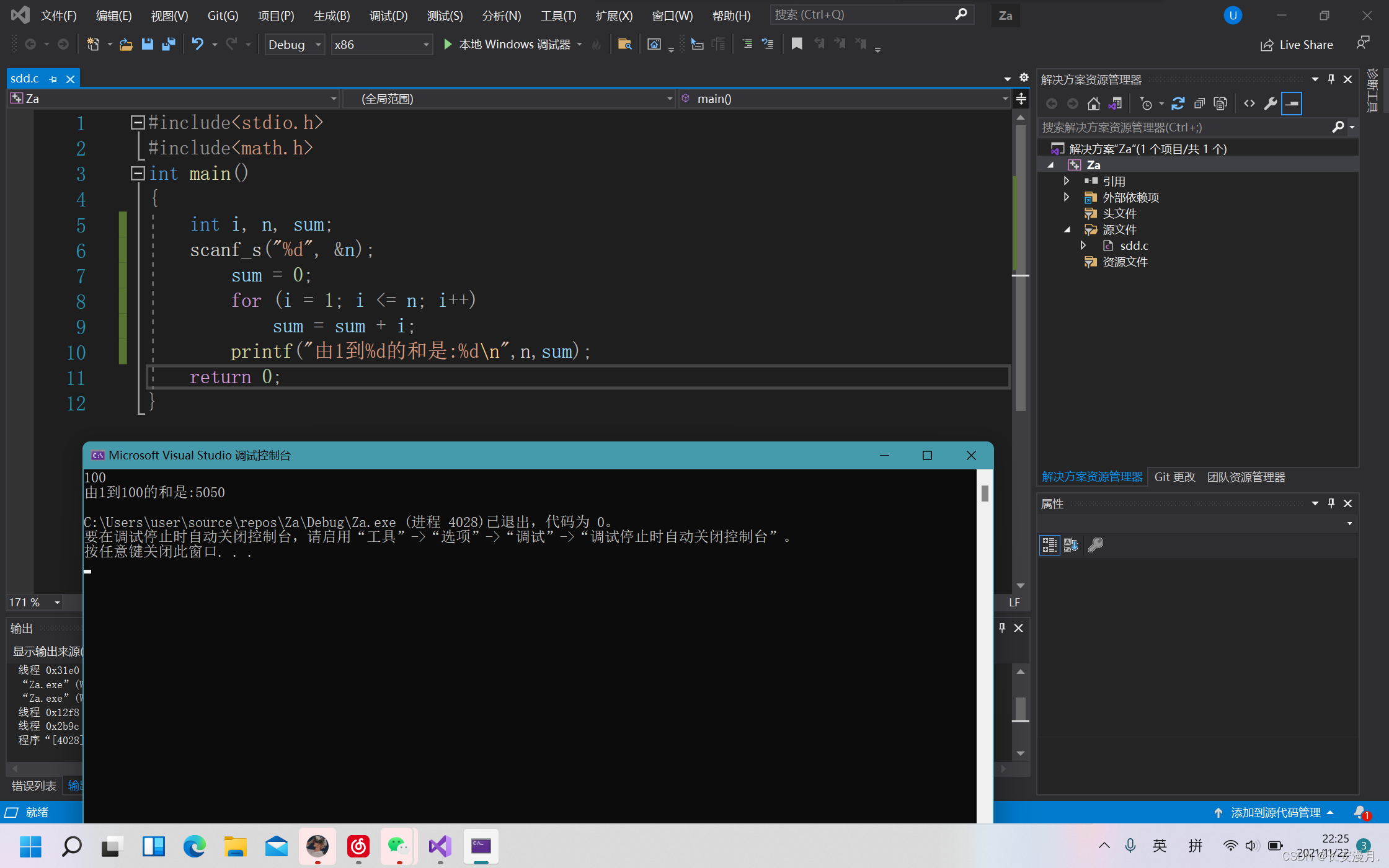 ?#include<stdio.h> #include<math.h> int main() { ?int i, n, sum; ?scanf_s("%d", &n); ? sum = 0; ? for (i = 1; i <= n; i++) ? ?sum = sum + i; ? printf("由1到%d的和是:%d\n",n,sum); ?return 0; }