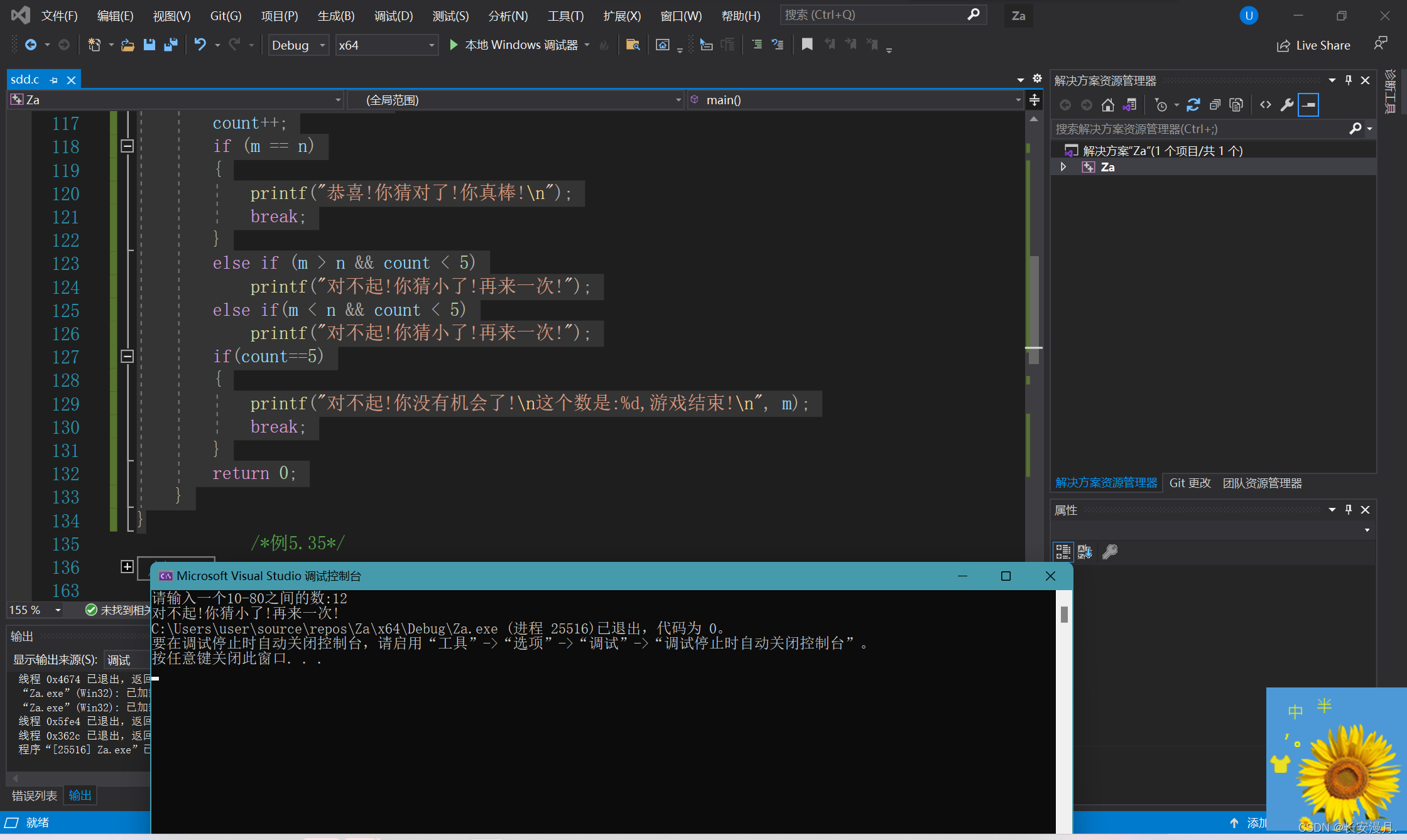 int main() { ? ? int m, n, count = 0; ? ? m = rand() % (80 - 10 + 1) + 10; ? ? printf("请输入一个10-80之间的数:"); ? ? while (1) { ? ? ? ? scanf_s("%d", &n); ? ? ? ? count++; ? ? ? ? if (m == n) ? ? ? ? { ? ? ? ? ? ? printf("恭喜!你猜对了!你真棒!\n"); ? ? ? ? ? ? break; ? ? ? ? } ? ? ? ? else if (m > n && count < 5) ? ? ? ? ? ? printf("对不起!你猜小了!再来一次!"); ? ? ? ? else if(m < n && count < 5) ? ? ? ? ? ? printf("对不起!你猜小了!再来一次!"); ? ? ? ? if(count==5) ? ? ? ? { ? ? ? ? ? ? printf("对不起!你没有机会了!\n这个数是:%d,游戏结束!\n", m); ? ? ? ? ? ? break; ? ? ? ? } ? ? ? ? return 0; ? ? } }