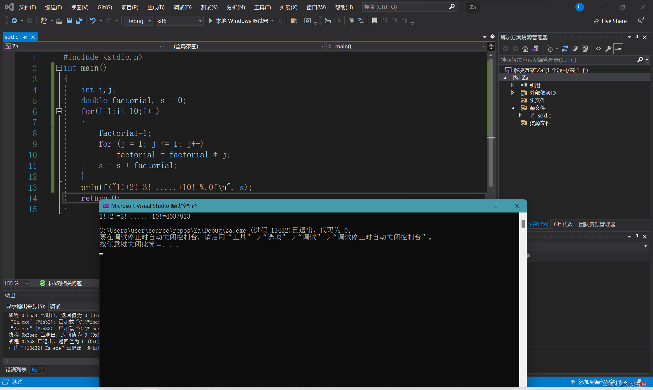 int main() { ?int i,j; ?double factorial, s = 0; ?for(i=1;i<=10;i++) ?{ ? factorial=1; ? for (j = 1; j <= i; j++) ? ?factorial = factorial * j; ? s = s + factorial; ?} ?printf("1!+2!=3!+.....+10!=%.0f\n", s); ?return 0; }