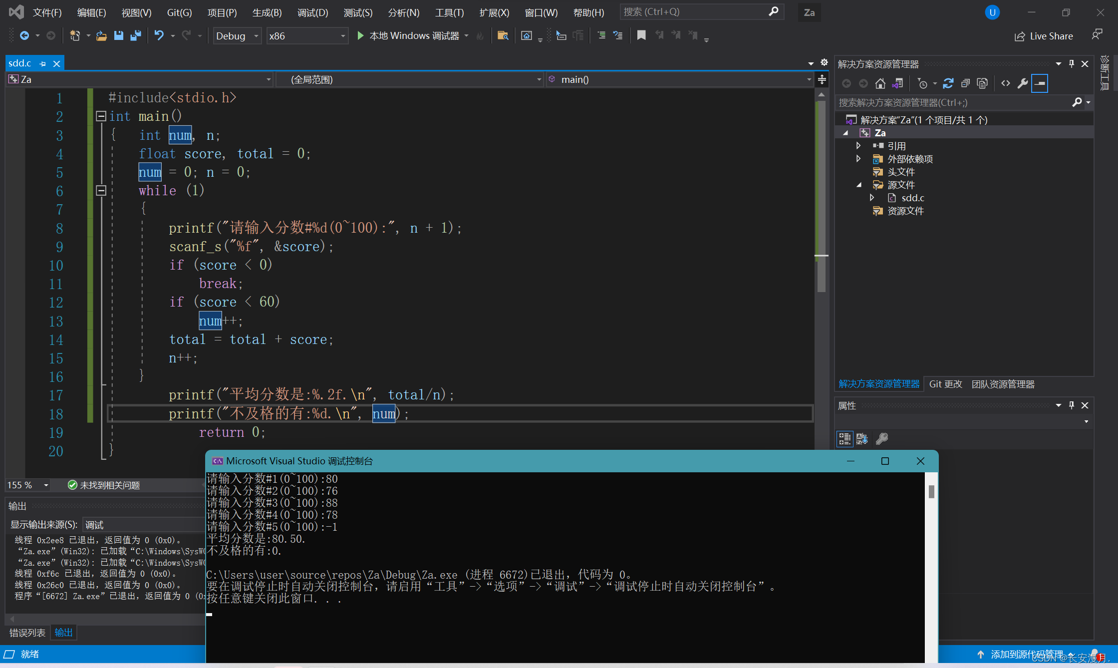 int main() { int num, n; ?float score, total = 0; ?num = 0; n = 0; ?while (1) ?{ ? printf("请输入分数#%d(0~100):", n + 1); ? scanf_s("%f", &score); ? if (score < 0) ? ?break; ? if (score < 60) ? ?num++; ? total = total + score; ? n++; ?} ? printf("平均分数是:%.2f.\n", total/n); ? printf("不及格的有:%d.\n", num); ? ?return 0; }