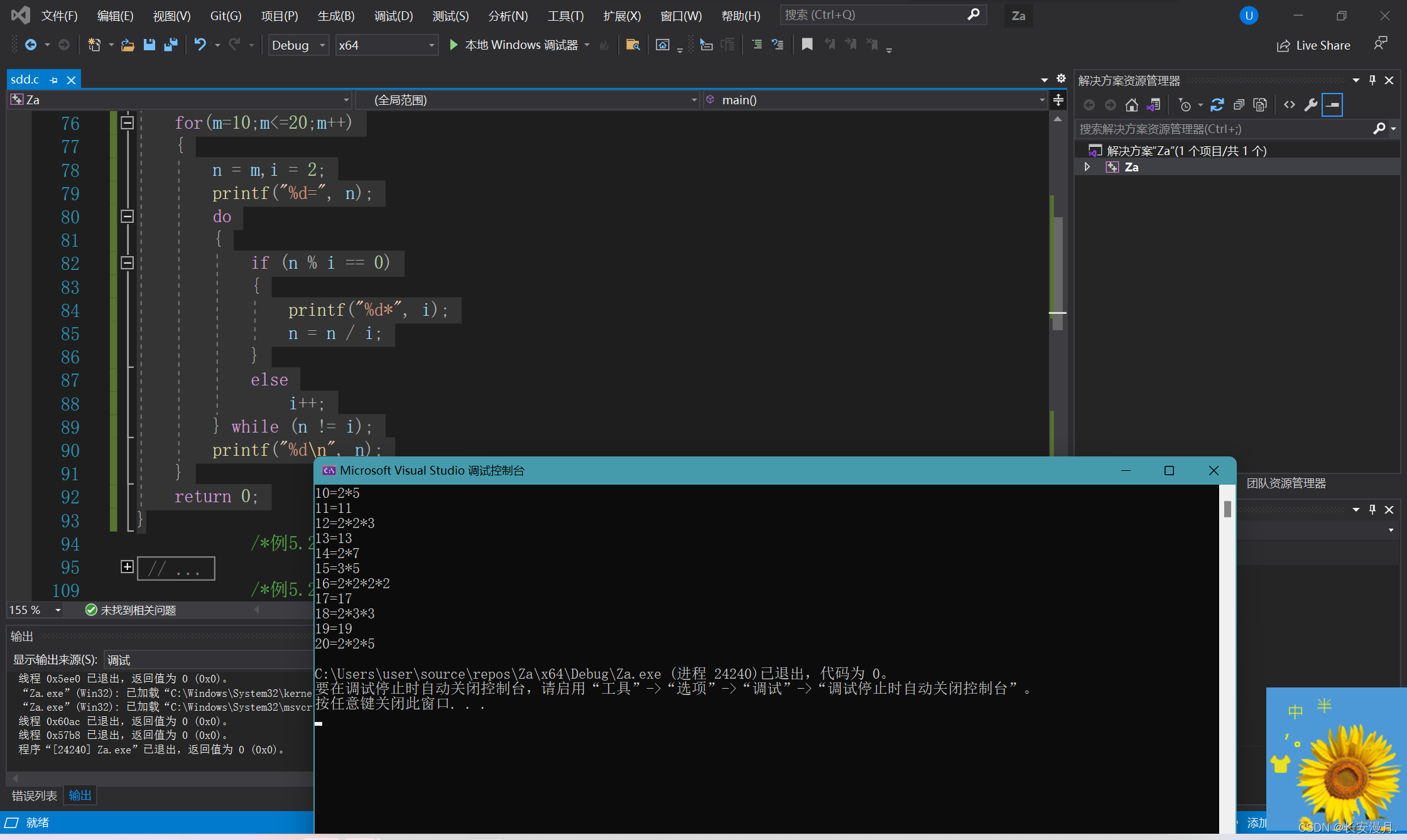 int main() { ? ? int i, n, m; ? ? for(m=10;m<=20;m++) ? ? { ? ? ? ? n = m,i = 2; ? ? ? ? printf("%d=", n); ? ? ? ? do ? ? ? ? { ? ? ? ? ? ? if (n % i == 0) ? ? ? ? ? ? { ? ? ? ? ? ? ? ? printf("%d*", i); ? ? ? ? ? ? ? ? n = n / i; ? ? ? ? ? ? } ? ? ? ? ? ? else ? ? ? ? ? ? ? ? i++; ? ? ? ? } while (n != i); ? ? ? ? printf("%d\n", n); ? ? } ? ? return 0; }