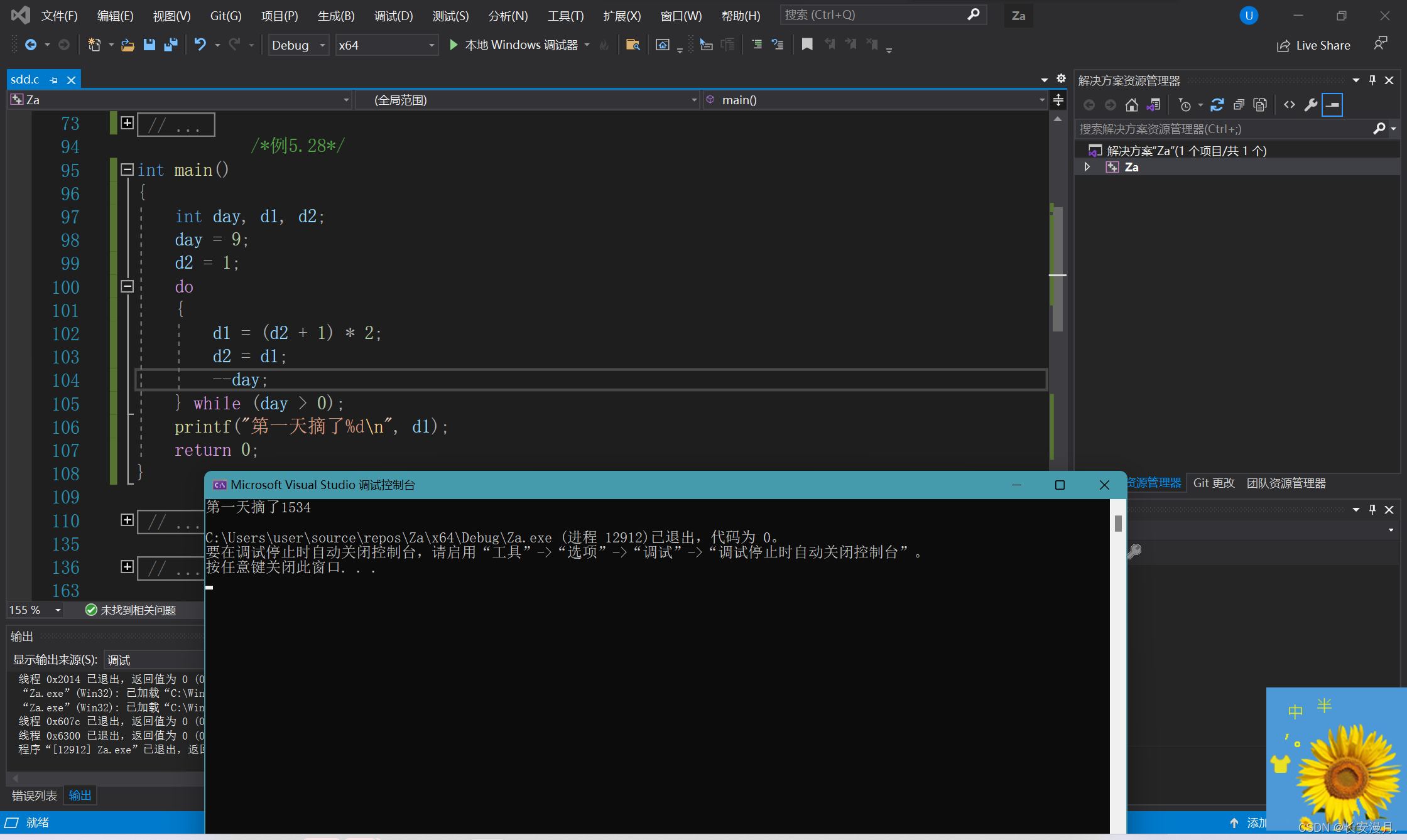 int main() { ? ? int day, d1, d2; ? ? day = 9; ? ? d2 = 1; ? ? do ? ? { ? ? ? ? d1 = (d2 + 1) * 2; ? ? ? ? d2 = d1; ? ? ? ? --day; ? ? } while (day > 0); ? ? printf("第一天摘了%d\n", d1); ? ? return 0; }例5.30 求sin()=x-x33! +…的近视值,要求精确到10-6
