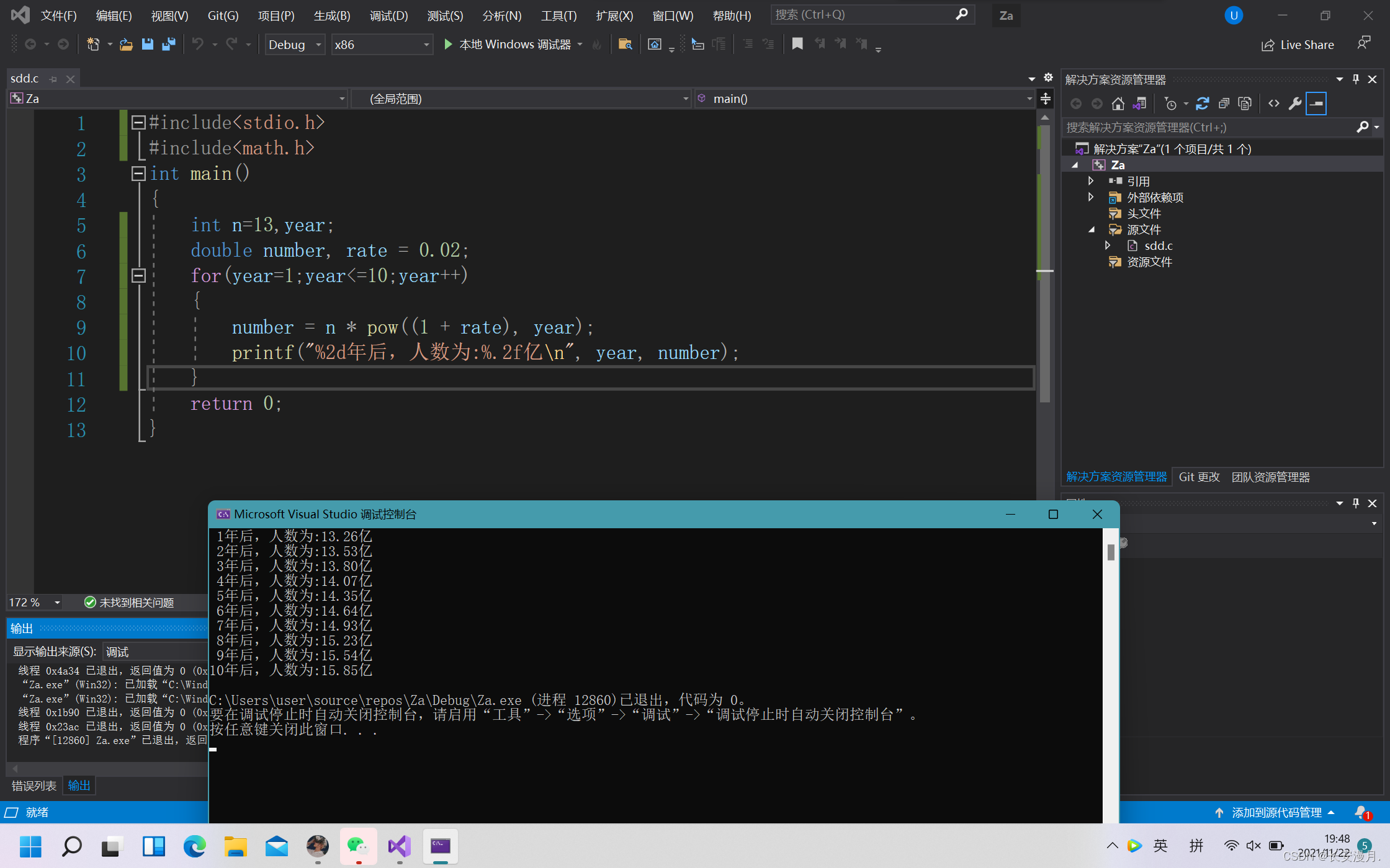 #include<stdio.h> #include<math.h> int main() { ?int n=13,year; ?double number, rate = 0.02; ?for(year=1;year<=10;year++) ?{ ? number = n * pow((1 + rate), year); ? printf("%2d年后,人数为:%.2f亿\n", year, number); ?} ?return 0; }