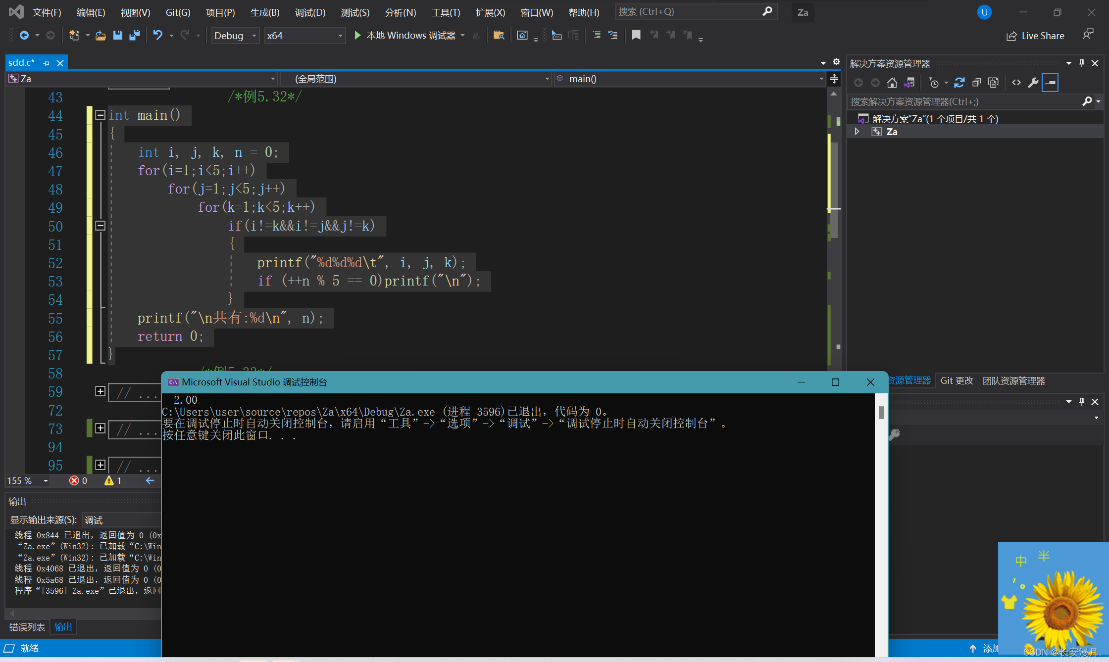 int main() { ? ? int i, j, k, n = 0; ? ? for(i=1;i<5;i++) ? ? ? ? for(j=1;j<5;j++) ? ? ? ? ? ? for(k=1;k<5;k++) ? ? ? ? ? ? ? ? if(i!=k&&i!=j&&j!=k) ? ? ? ? ? ? ? ? { ? ? ? ? ? ? ? ? ? ? printf("%d%d%d\t", i, j, k); ? ? ? ? ? ? ? ? ? ? if (++n % 5 == 0)printf("\n"); ? ? ? ? ? ? ? ? } ? ? printf("\n共有:%d\n", n); ? ? return 0; }