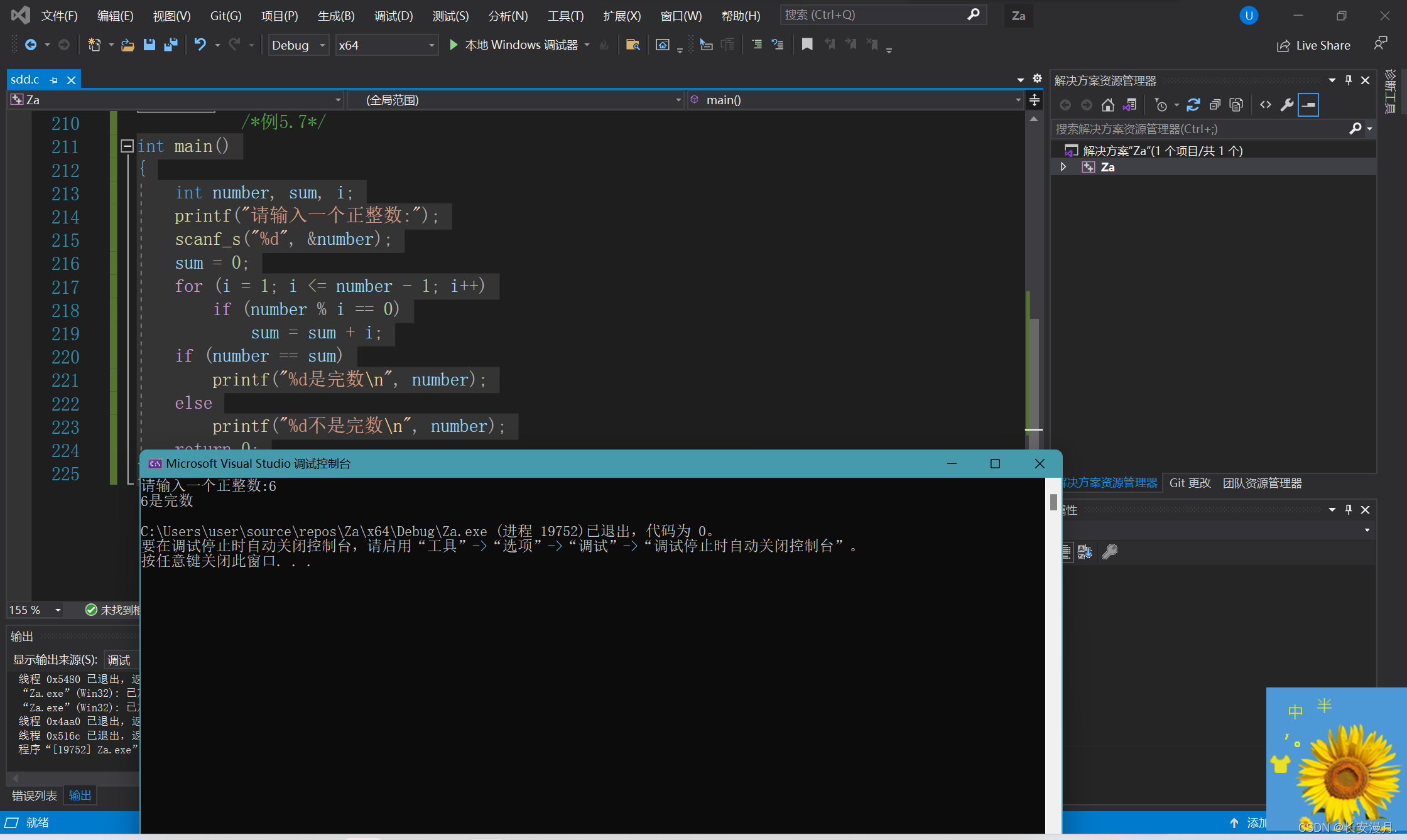 int main() { ? ? int number, sum, i; ? ? printf("请输入一个正整数:"); ? ? scanf_s("%d", &number); ? ? sum = 0; ? ? for (i = 1; i <= number - 1; i++) ? ? ? ? if (number % i == 0) ? ? ? ? ? ? sum = sum + i; ? ? if (number == sum) ? ? ? ? printf("%d是完数\n", number); ? ? else ? ? ? ? printf("%d不是完数\n", number); ? ? return 0; }