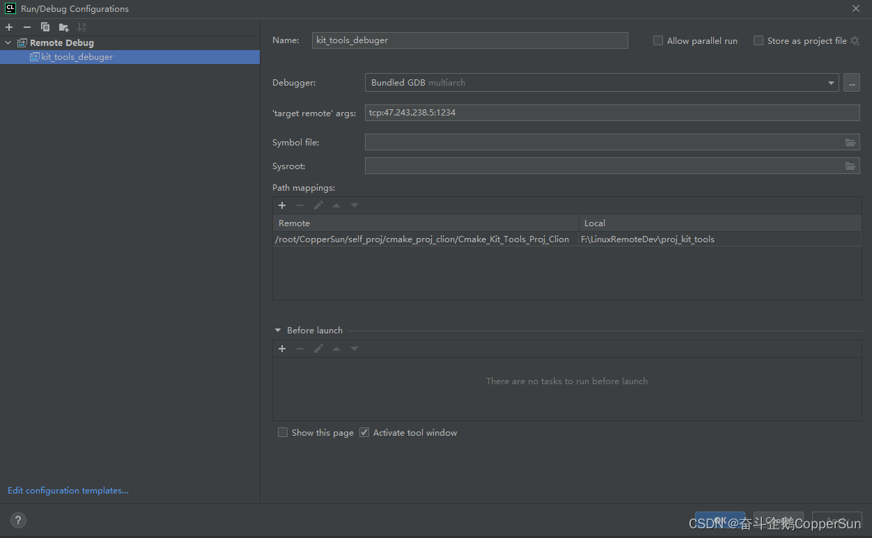 - 设置远程访问参数 (target remote args) : tcp:xx.xx.xx.xx:1234