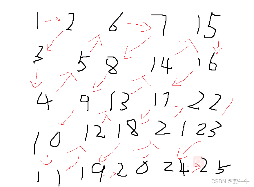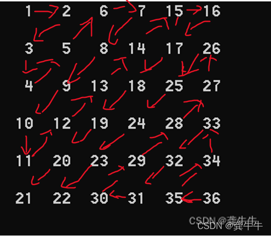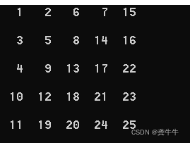 ?#include <stdio.h> #define N 5 int main() { ?? ?int i,j,k=1; ?? ?int q[N][N]={0}; ?? ?for(i=0;i<N;i++){ //上半边? ?? ??? ?if(i%2==1) //讨论向上还是向下? ?? ??? ?for(j=i;j>=0;j--){ //向下递增 ? ?? ??? ??? ?q[i-j][j]=k;? ?? ??? ??? ?k++; ?? ??? ?} ?? ??? ?else? ?? ??? ?for(j=i;j>=0;j--){ //向上递增? ?? ??? ??? ?q[j][i-j]=k;? ?? ??? ??? ?k++; ?? ??? ?} ?? ?}? ?? ?if(N%2) //判断? ?? ?{ ?? ?for(i=1;i<N;i++){ //奇数下半边 ,正常赋值? ?? ??? ?if(i%2==1) ?? ??? ?for(j=N;j>i;j--){ ?? ??? ? ? ?q[i+N-j][j-1]=k; ?? ??? ? ? ?k++; ?? ??? ?} ?? ??? ?else? ?? ??? ?for(j=i;j<N;j++){ ?? ??? ??? ?q[N+i-j-1][j]=k; ?? ??? ??? ?k++;?? ? ?? ??? ?} ?? ?} ?? ?} ?? ?else{ ? //偶数下半边 ,改变赋值方法? ?? ??? ?int k1=N*N;?? ??? ?// 从右下顶点开始赋值? ?? ??? ?for(i=N-1;i>0;i--){? ?? ??? ??? ?if(i%2==1) ?? ??? ??? ?for(j=N;j>i;j--){ ?? ??? ??? ? ? ?q[i+N-j][j-1]=k1; ?? ??? ??? ? ? ?k1--; ?? ??? ??? ?} ?? ??? ??? ?else? ?? ??? ??? ?for(j=i;j<N;j++){ ?? ??? ??? ??? ?q[N+i-j-1][j]=k1; ?? ??? ??? ??? ?k1--;?? ? ?? ??? ??? ?} ?? ??? ?} ?? ?} ? ? for(i=0;i<N;i++){ //输出? ?? ??? ?for(j=0;j<N;j++){ ?? ??? ??? ?printf("%4d",q[i][j]); ?? ??? ?} ?? ??? ?putchar(10); ?? ??? ?putchar(10); ?? ?} ?? ?return 0; }