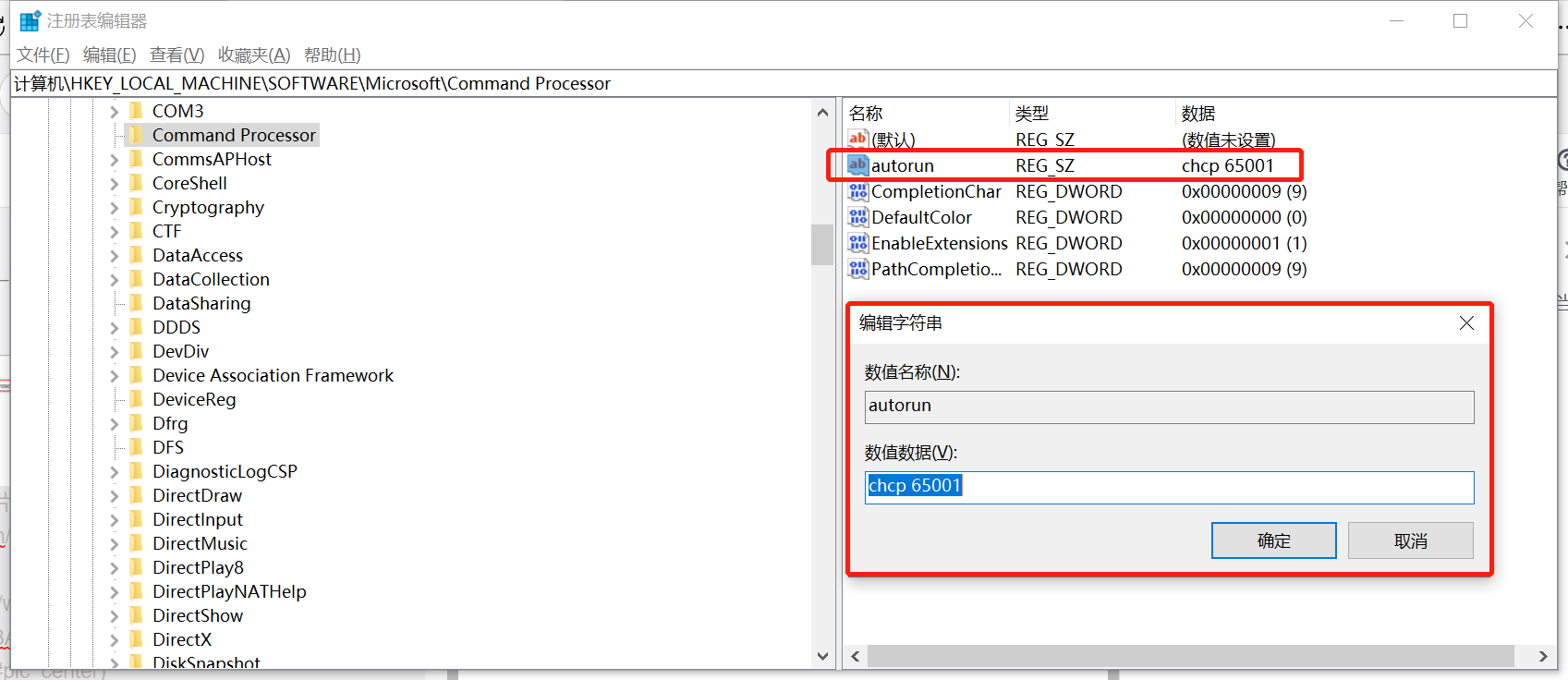 - 右键单击右侧区域,选择“新建”-“字符串值”,然后选择“修改”,编辑“数值名称”为autorun、“数值数据”为chcp 65001如下图所示