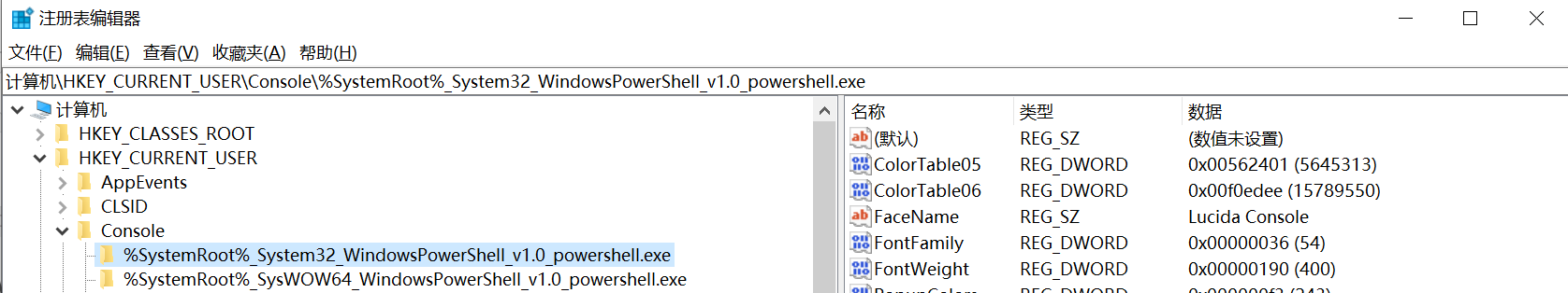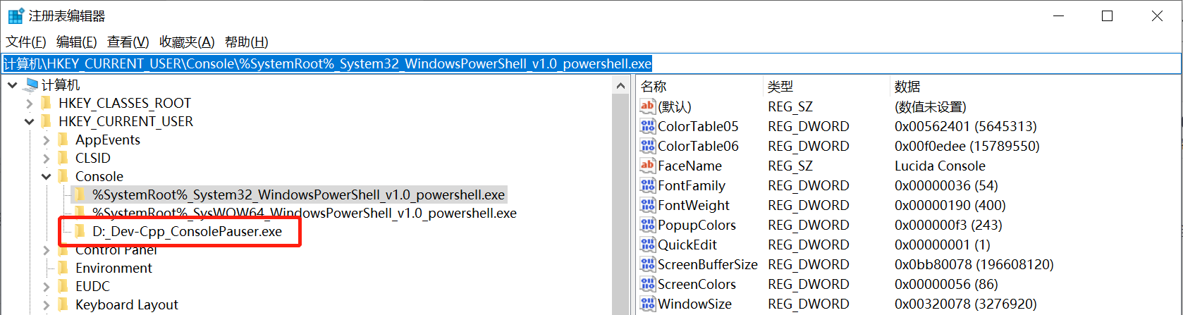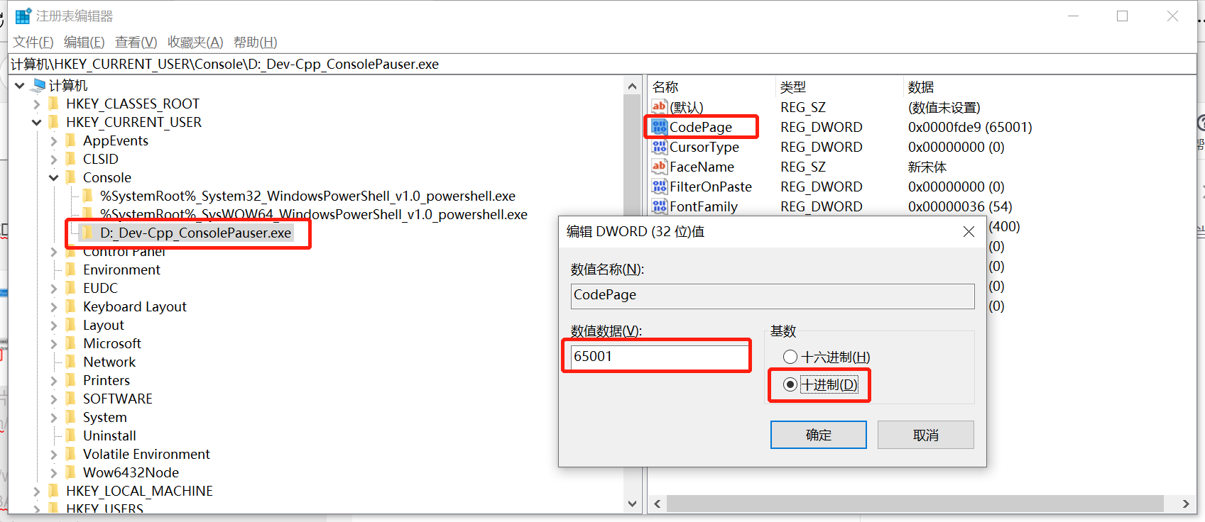 二、设置DEV-Cpp相关编码方式 网上有文章介绍定位到:HKEY_CURRENT_USER\Console\%SystemRoot%_system32_cmd.exe下修改CodePage的值,但是有的win10是没有这个目录存在的,只有WindowsPoweShell,在WindowsPoweShell下修改或添加CodePage根本没用!  正确的操作是在按“一、设置UTF-8为CMD默认编码方式”操作完成后,注册表