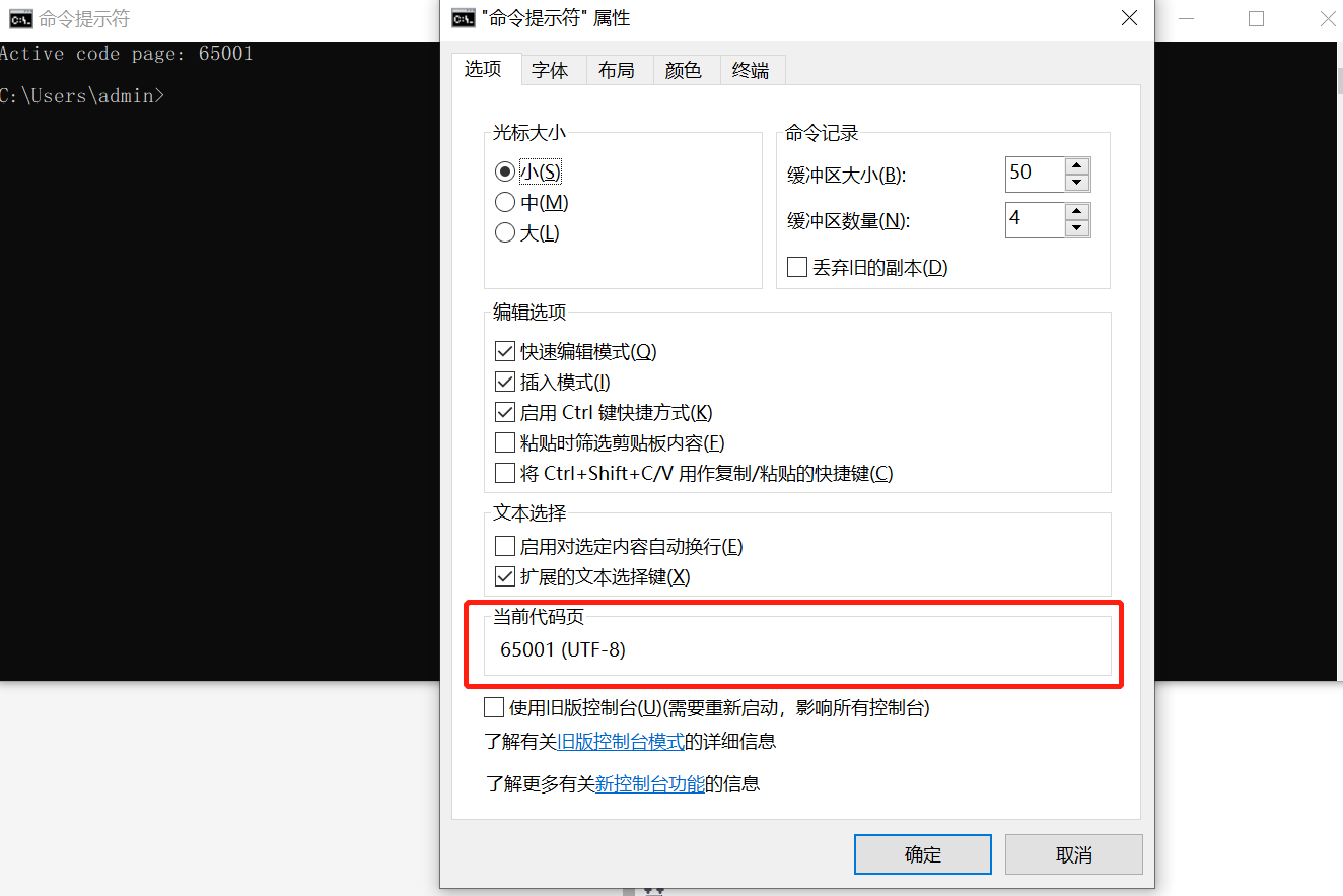 点击确定修改完成后,打开CMD查看其属性默认显示编码为utf-8  但此时通过DEV C++编译运行源码中文显示依旧乱码!