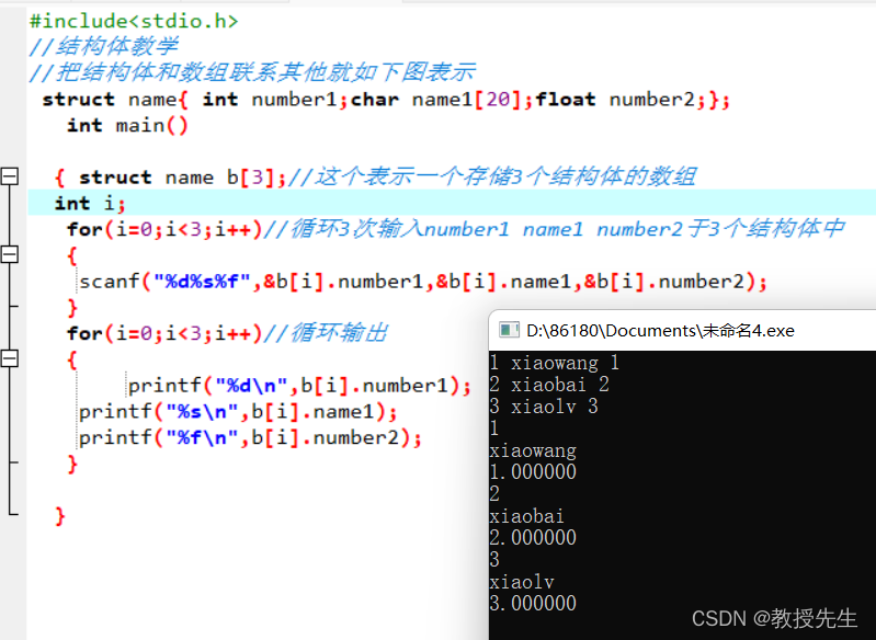 //结构体教学 首先,结构体的格式是在主函数前先定义结构体的格式 struct name{ int number1;char name1;float number2; }