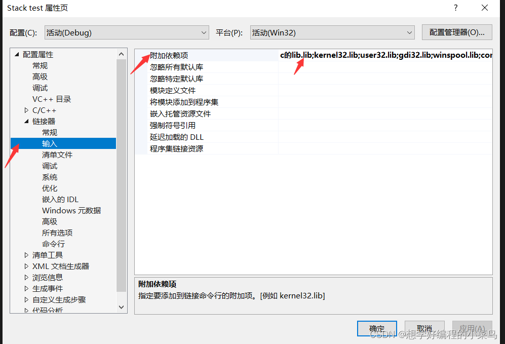 然后在链接器的输入下添加? c的lib.lib;(创建的项目名.lib)