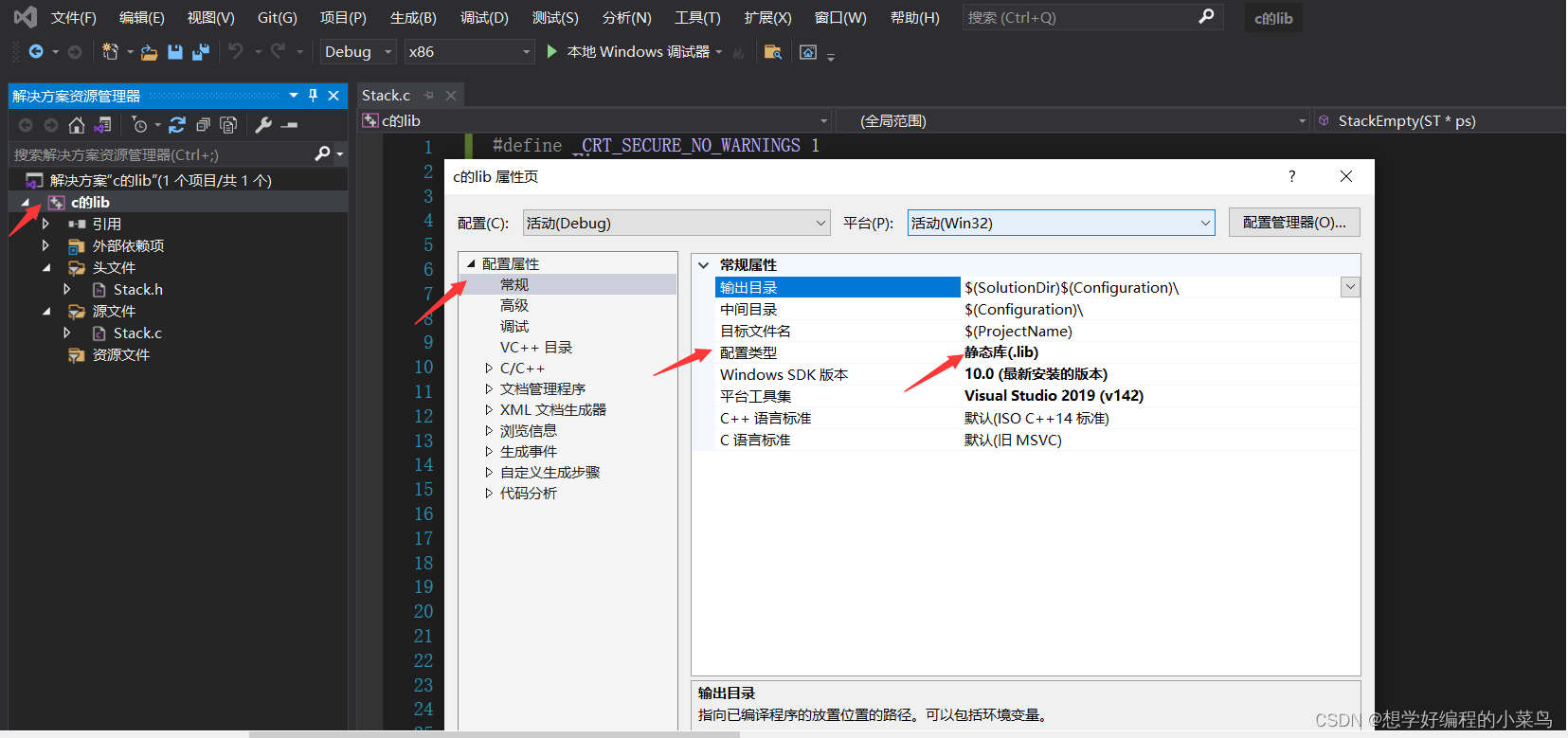 2.当我们写c++代码,要调用c代码时,可以将c的类型配置为静态库,然后直接调用头文件。