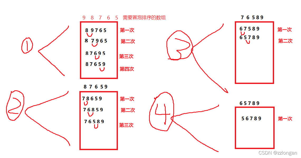 如果我们有 {9 ,8,7,6,5}的数组需要冒泡升序排序